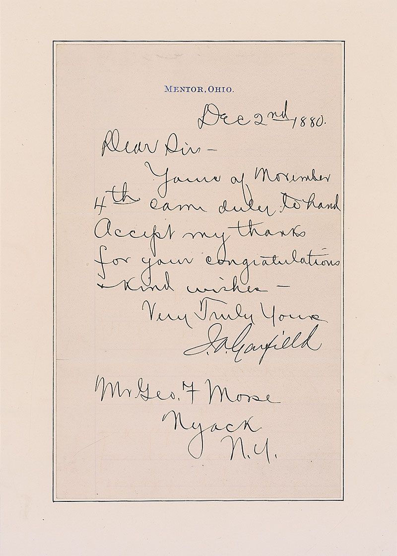 Choice LS signed as president-elect, “J. A. Garfield,” one page, lightly-lined, 5 x 8, Mentor, Ohio letterhead, December 2, 1880. Letter to George F. Morse of New York. In full: “Yours of November 4th…Accept my thanks for your congratulations & kind wishes.” Affixed by the left edge to a slightly larger card. In fine condition. Garfield had won the 1880 presidential election just one month earlier, on November 2, handily defeating Democratic candidate Winfield Scott Hancock in the electoral college despite an essential tie in the popular vote. Garfield presidential items are very scarce because he was assassinated, passing away just six months after taking office. The period in between being elected president and his inauguration was even shorter at four months, and autographic material as president-elect is often overlooked despite its comparability to items signed as president.