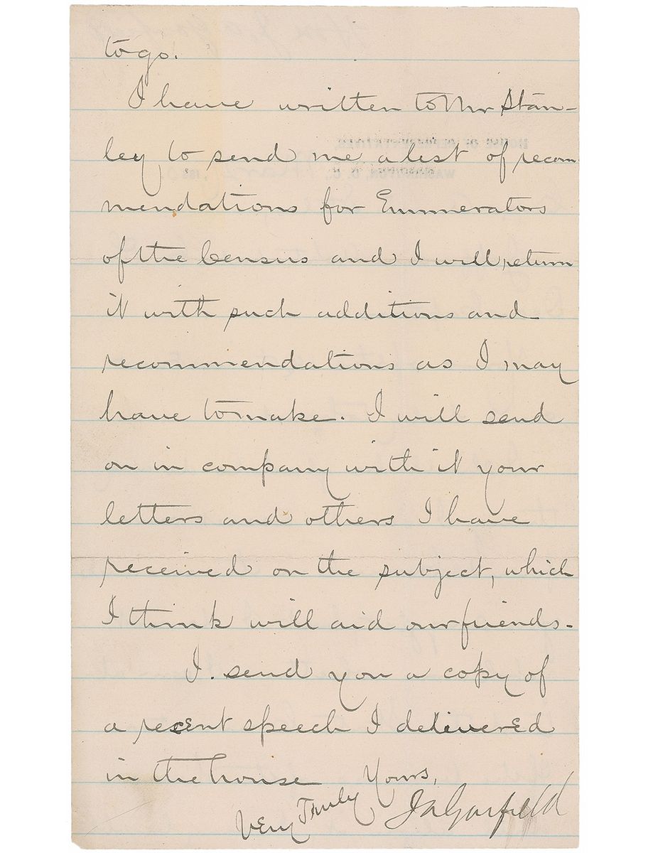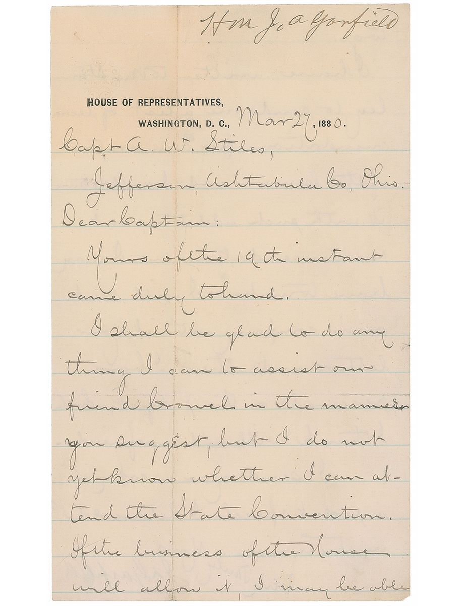 LS signed “J. A. Garfield,” one page, lightly-lined both sides, 4.75 x 7.75, House of Representatives letterhead, March 27, 1880. Letter to political ally Captain A. W. Stiles. In part: “I shall be glad to do any thing I can to assist our friend…but I do not yet know whether I can attend the State Convention. If the business of the House will allow it, I may be able to go.” In fine condition, with intersecting folds (one vertical fold passing through a single letter of the signature) and a brush to signature. Just a few months later on June 8, 1880, Garfield was nominated to run as the Republican candidate in the upcoming presidential election. A desirable example written just as his ill-fated run to the presidency was about to begin.