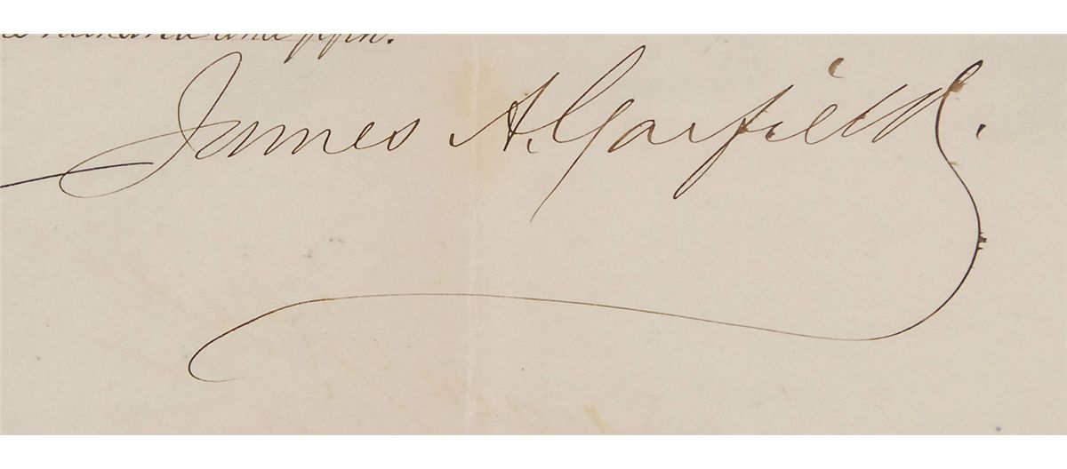 Partial self-contained partly-printed DS as president, one page, 22.75 x 8, May 19, 1881. Lower portion of a presidential appointment, nicely signed by Garfield and countersigned by Secretary of State James Blaine. In fine condition, with vertical folds (one touching middle initial of signature), some mirroring of Blaine’s signature from folding, a slightly irregular top edge, and a few spots of mild toning. The large white seal is crisp and intact. Any document signed by Garfield while in office is extremely rare, ranking second only to William Henry Harrison in scarcity.