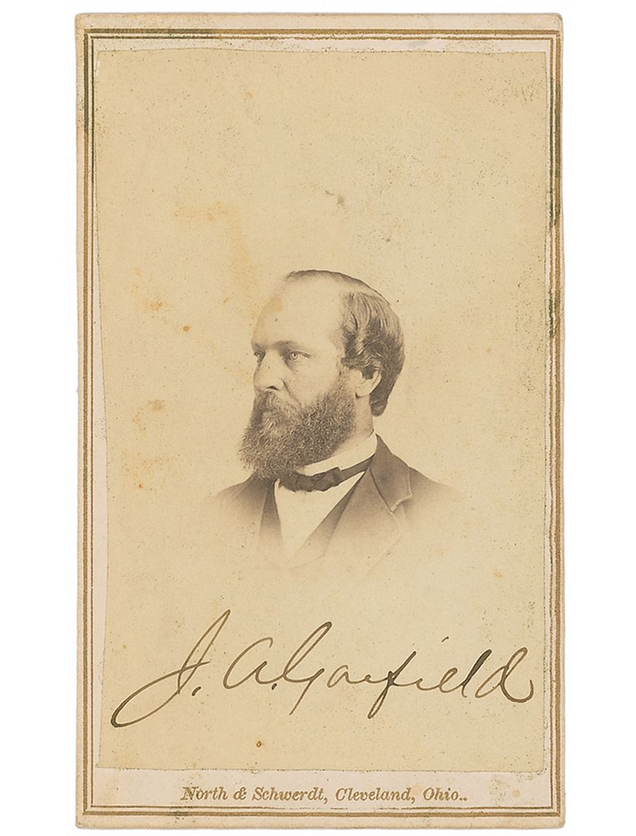Rare 2.25 x 4 carte-de-visite bust portrait of Garfield, circa mid–1860s, signed at the bottom of the image in crisp black ink, “J. A. Garfield.” Published by North & Schwerdt of Cleveland. A three-cent revenue stamp is affixed to the reverse. Light scattered surface marks and soiling, otherwise fine condition. A highly desirable example, earlier than generally seen.