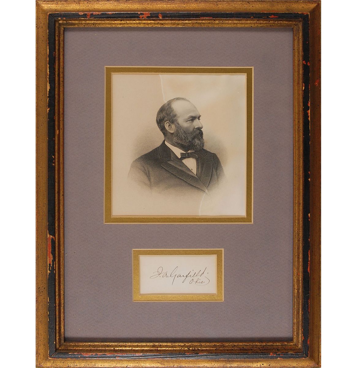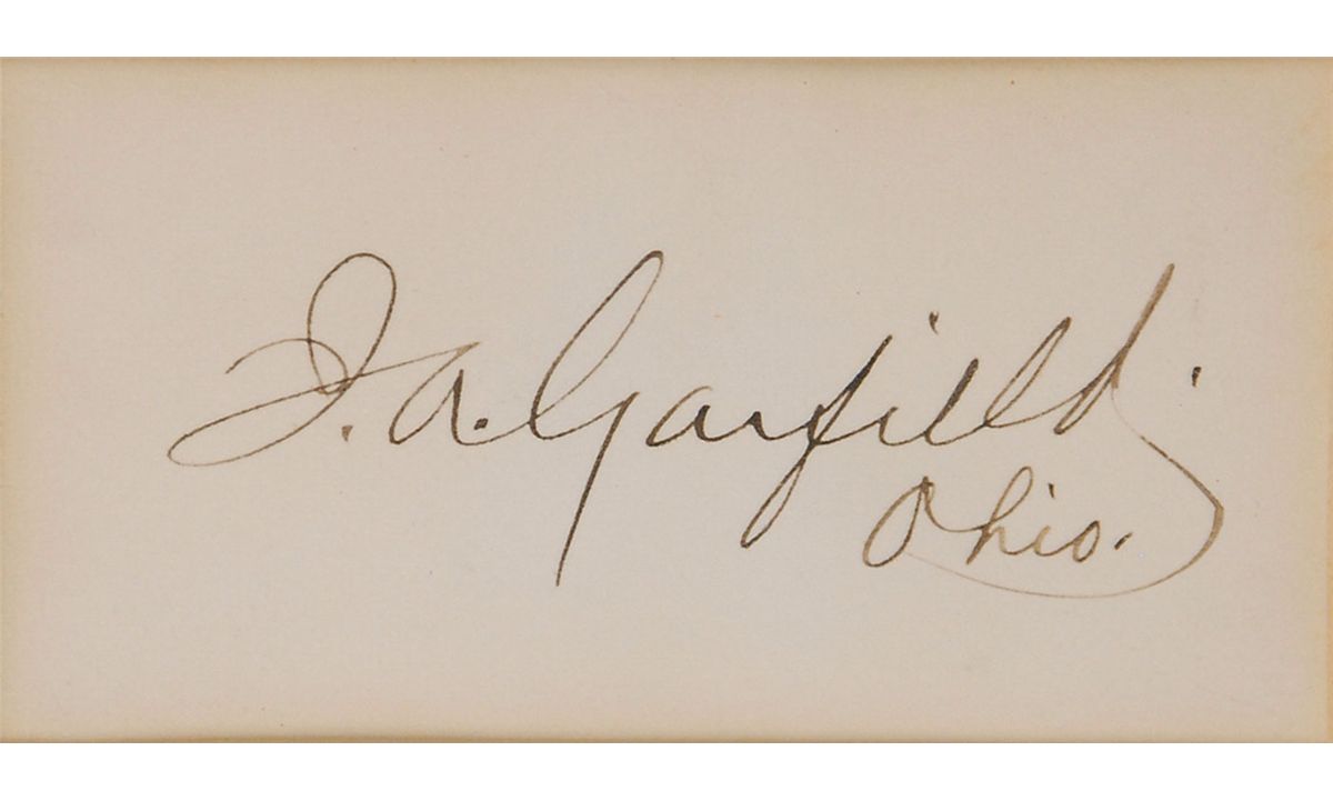 Ink signature, “J. A. Garfield, Ohio,” on an off-white 3 x 1.5 slip. Double-matted and framed with an irregularly toned engraved portrait to an overall size of 11 x 14. In fine condition.