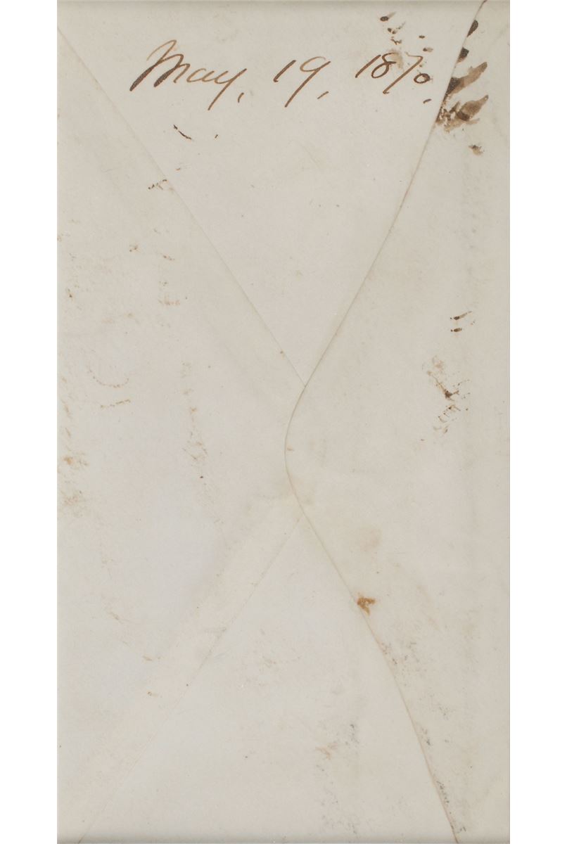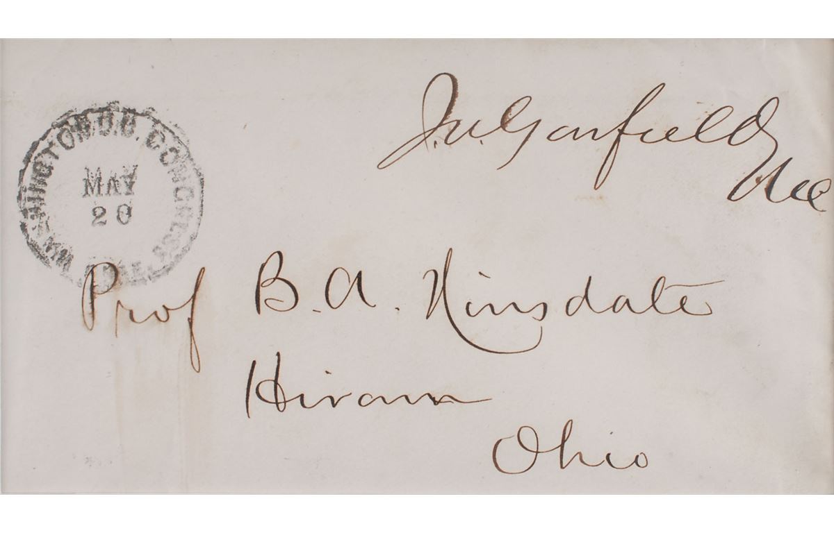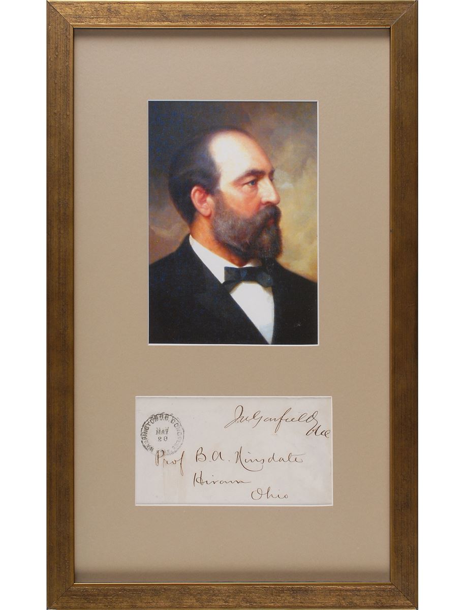 Free franked mailing envelope, 5.25 x 3, addressed in another hand to “Prof. B. A. Hinsdale, Hiram, Ohio,” and franked in the upper right, “J. A. Garfield, MC.” Postmarked at Washington, May 20, with a docketing date notation of 1870 on the reverse. Handsomely matted and framed with a portrait of Garfield to an overall size of 10 x 16.5. In fine condition, with a bit of brushing to ink.