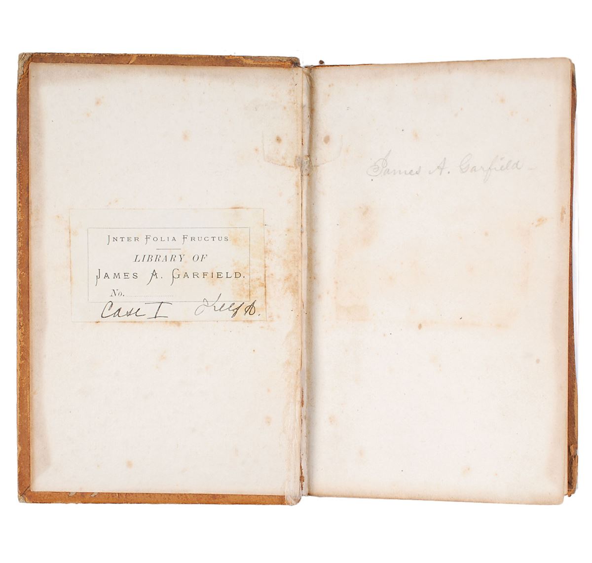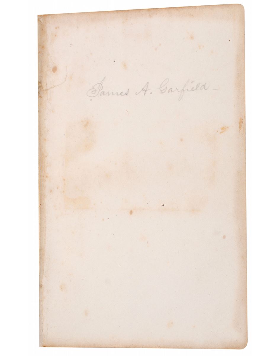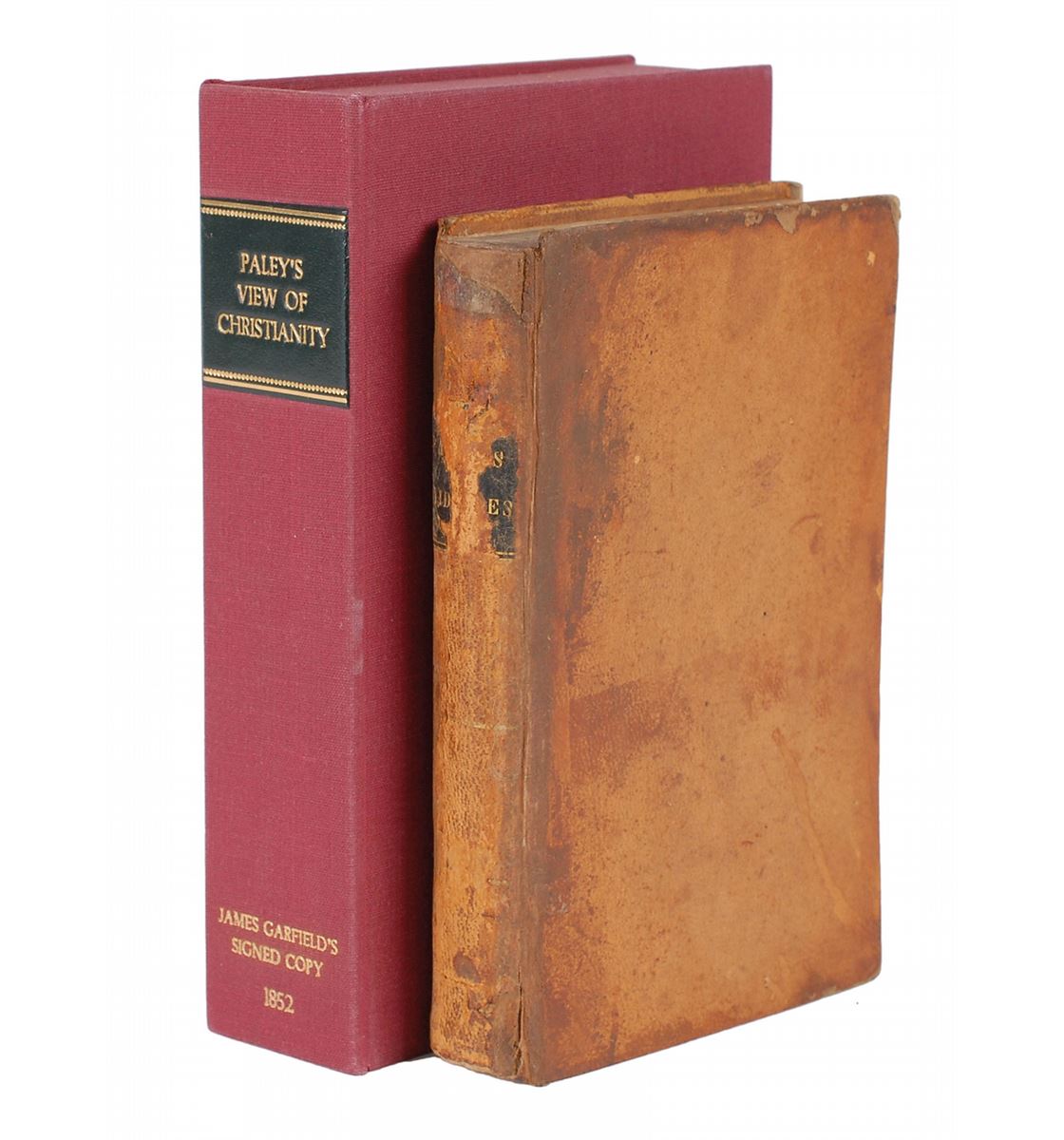 Signed book: Archdeacon Paley’s View of the Evidences of Christianity. Philadelphia: Troutman & Hayes, 1852. Hardcover, 4 x 6, 264 pages. Signed on the first free end page in pencil with his ownership signature, “James A. Garfield.” Garfield’s personal bookplate is also affixed to the front pastedown. Autographic condition: very good, with foxing, soiling, and a small tear to the first free end page. Book condition: G+/None. Accompanied by a custom-made clamshell box. The first Presidential memorial library, completed at the Lawnfield estate in Ohio by First Lady Lucretia Garfield four years after her husband’s assassination, houses almost 3,000 books that were used and treasured by the 20th president. More than two decades ago, several dozen of his books were de-accessioned, with this personal volume among them.