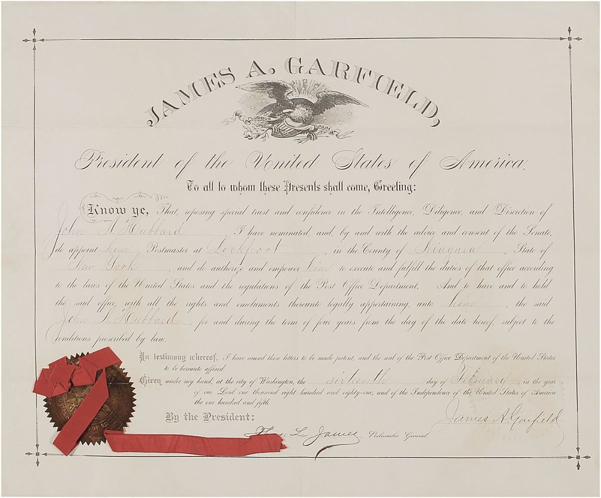 Extremely rare partly-printed DS as president, one page, 17 x 14, February 16, 1881. President Garfield appoints John A. Hubbard to the position of Postmaster of Lockport, New York. Signed at the conclusion in black ink by Garfield, and countersigned by Postmaster General Thomas L. James. Intersecting folds, some light toning and mirroring of seal and ribbon to right side of document (a portion of which is over Garfield’s signature, but does not affect the clarity or legibility at all), and some scattered light creases, otherwise fine condition. The gold foil seal is toned, but intact, and retains its original bright red ribbons.