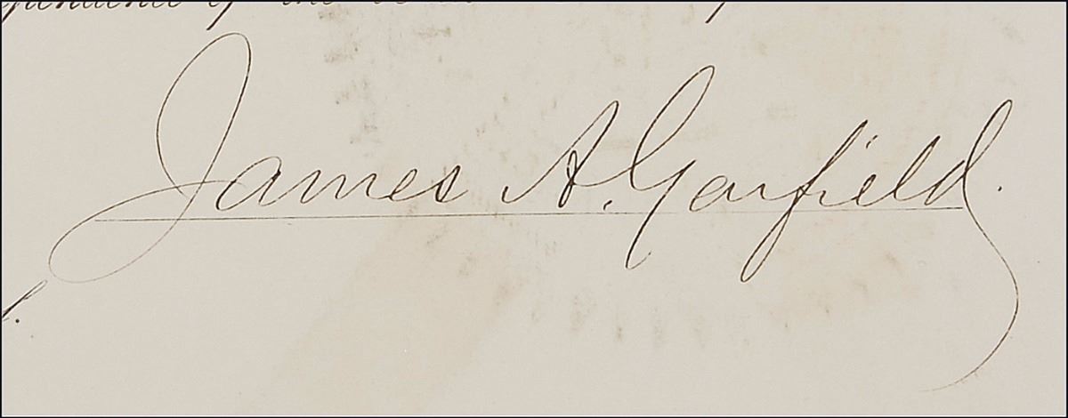 Garfield died just 200 days into his presidency, but hit the ground running when it came to making a plethora of appointments. Mistakenly dated about three weeks before Garfield actually assumed the high office on March 4, 1881, this oversight was most likely a casualty of the hectic environment surrounding the rigors of political nominations and appointments. Interestingly enough, when Garfield took office, the Post Office Department was the largest department in the federal government—and highly prone to corruption—an embarrassment to both the president and his Republican Party. Documents signed by Garfield while in office are extremely rare, ranking second only to William Henry Harrison in scarcity.