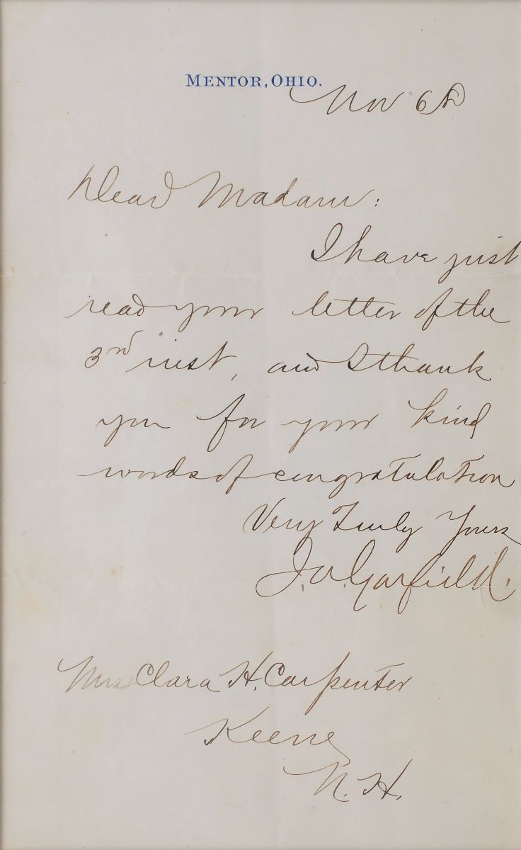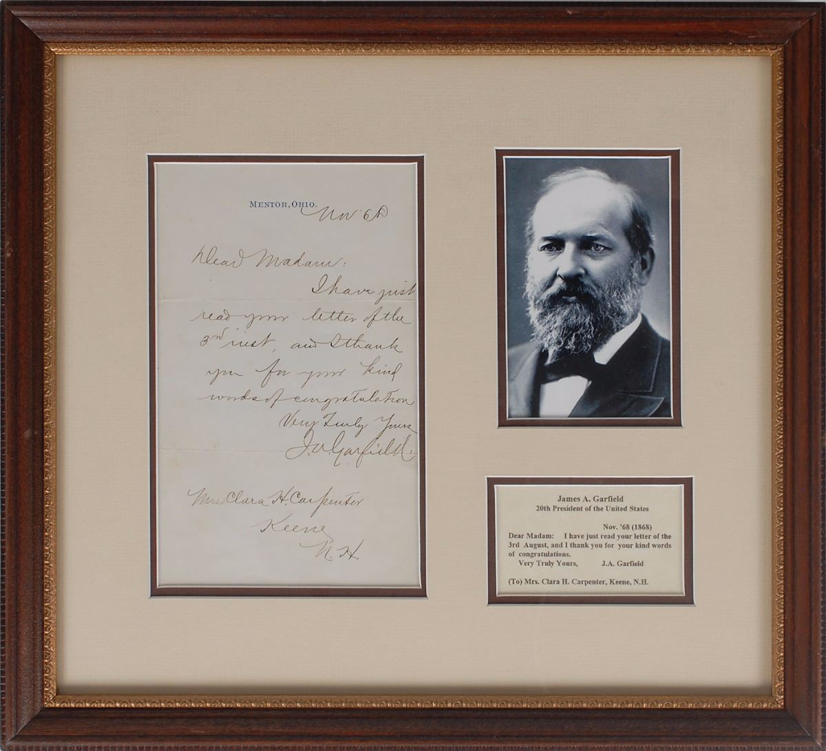 LS as senator, signed “J. A. Garfield,” one page, 4.75 x 7.75, Mentor, Ohio letterhead, November 1868. Letter to Clara H. Carpenter, in full: “I have just read your letter of the 3rd inst., and I thank you for your kind words of congratulations.” Double-matted and framed with an image of Garfield and a small description of the letter. In fine condition.