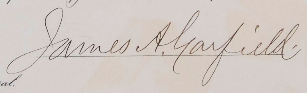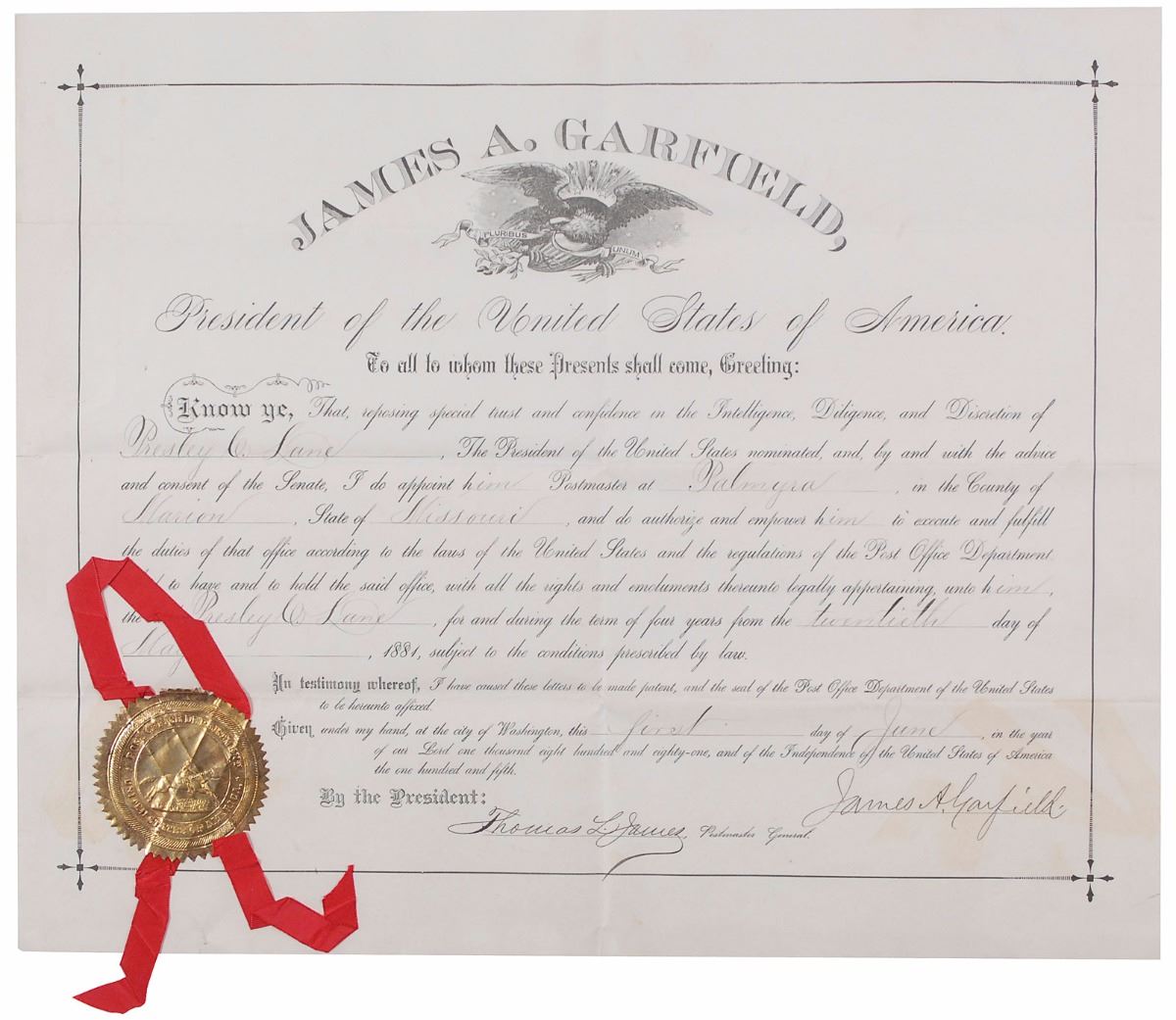 Rare partly-printed DS as president, signed “James A. Garfield,” one page, 17 x 14, June 1, 1881. President Garfield appoints Presley C. Lane as “Postmaster at Palmyra, in the county of Marion, State of Missouri.” Crisply signed at the conclusion by Garfield and countersigned by Postmaster General Thomas L. James. The gold seal and red ribbon affixed to the lower left remain crisp and fully intact. In fine condition, with intersecting folds and light bands of toning to the signature area from the seal and ribbons. Accompanied by an unsigned engraved portrait. Lane was active in politics, representing Marion County in the state legislature in addition to his role as postmaster. Presidential appointments by Garfield are extremely scarce, as he actively served just four months as president—having taken the office in March 1881, he was shot on July 2 and passed away in September. An exemplary Garfield document from his brief term as executive.