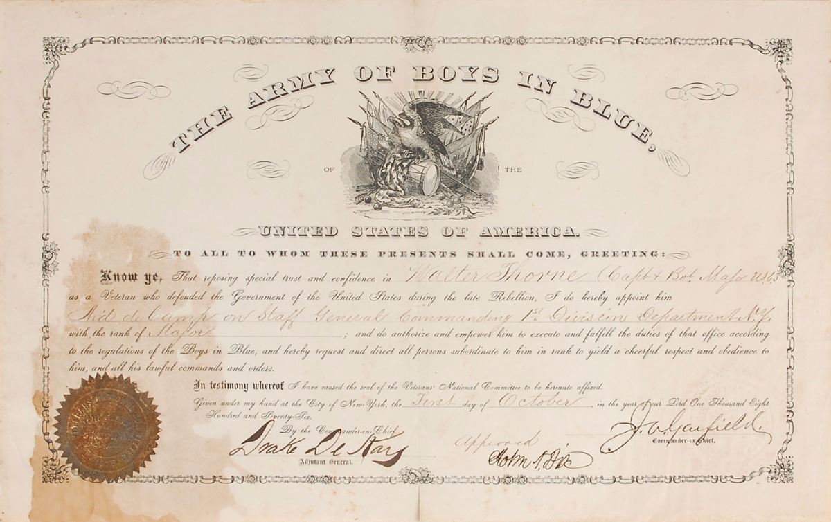 Uncommon partly-printed DS, signed “J. A. Garfield,” one page, 16 x 10, October 1, 1876. Garfield appoints Walter Thorne as “Aid de Camp on Staff general Commanding 1st Division Department N. Y. with the rank of Major.” Signed at the conclusion by Garfield as commander-in-chief, and countersigned by Drake DeKay as adjutant general. Gold seal affixed to lower left remains intact. In very good to fine condition, with small split along vertical fold, and scattered seal-related staining, heaviest to lower left quadrant. Accompanied by an unsigned engraving.