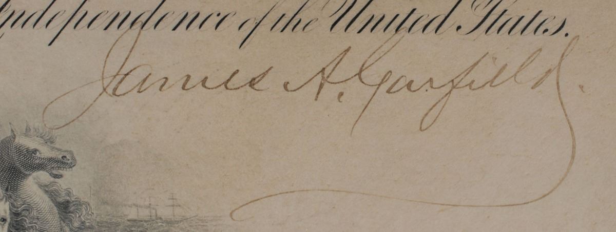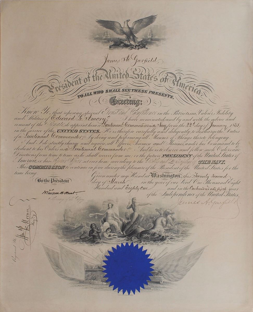 Rare partly-printed DS as president, one page, 14.75 x 18.25, March 22, 1881. President Garfield appoints Edward L. Amory as “a Lieutenant Commander in the Navy.” Neatly signed at the conclusion in full by President Garfield and countersigned by Secretary of the Navy William H. Hunt. The blue seal affixed at the bottom remains fully intact. Permanently affixed to a cardstock backing and professionally cleaned, with smoothed intersecting folds, light scattered toning, and evenly trimmed edges, otherwise fine condition. This naval commission dates to just three weeks into Garfield’s presidency, which came to a tragic halt after he was shot in July. Given his brief tenure, any presidential document issued by Garfield is rare and highly sought-after.