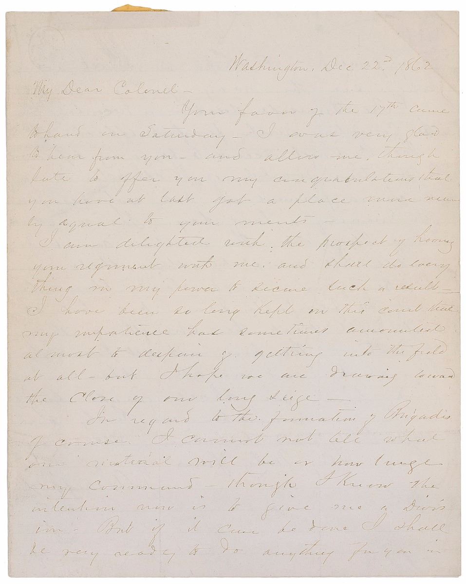 Civil War–dated ALS signed “J. A. Garfield,” one page both sides, 8 x 10, December 22, 1862. Letter to a colonel, in part: “Allow me, though late to offer you my congratulations that you have at last got a place…equal to your merits. I am delighted with the prospect of having your regiment with me and shall do everything in my power to secure such a result. I have been so long kept in this court that my impatience has sometimes amounted almost to despair of getting into the field at all—but I hope we are drawing toward the close of our long siege. In regard to the formation of Brigades of course I cannot not tell what our material will be or how large my command—though I know the intention now is to give me a Division—But if it can be done I shall be very ready to do anything for you in my power—I hope we shall before long see the way open for work. The Cabinet seems to be going to pieces and this world of Washington is in such a ferment as had not been seen for many a long day. The war must be a long one—the rebellion cannot be ended till we strike, strike, strike—and strike again—tough bloody blows that cost us fearfully dear, but that at last will break the strength of the South—We have not yet found the General to lead us all—When we find him we shall make swift work.” In fine condition, with light fading to text and signature, small splits along intersecting folds, and two old tape impressions at top edge and corner.