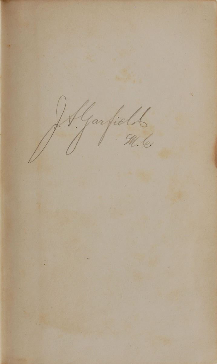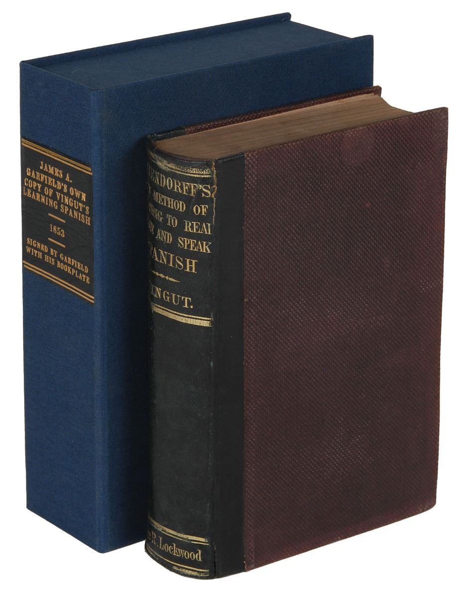 Signed book: Vingut’s Ollendorff’s New Method of Learning to Read, Write, and Speak the Spanish Language. Twelfth edition. NY: George Lockwood, 1853. Hardcover, 5 x 7.5, 357 pages. Signed on the first free end page in pencil with his ownership signature, “J. A. Garfield, M.C.” Garfield’s personal bookplate, “Inter Folia Fructus, Library of James A. Garfield,” is affixed to the front pastedown. Autographic condition: fine, with scattered faint foxing. Book condition: VG/None. Accompanied by a custom-made clamshell box.