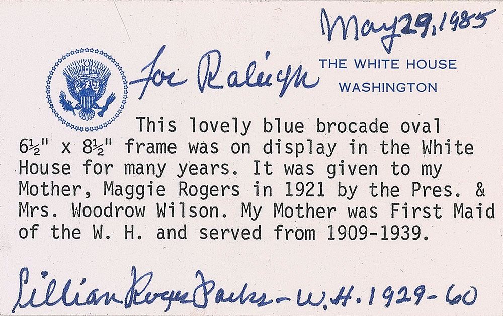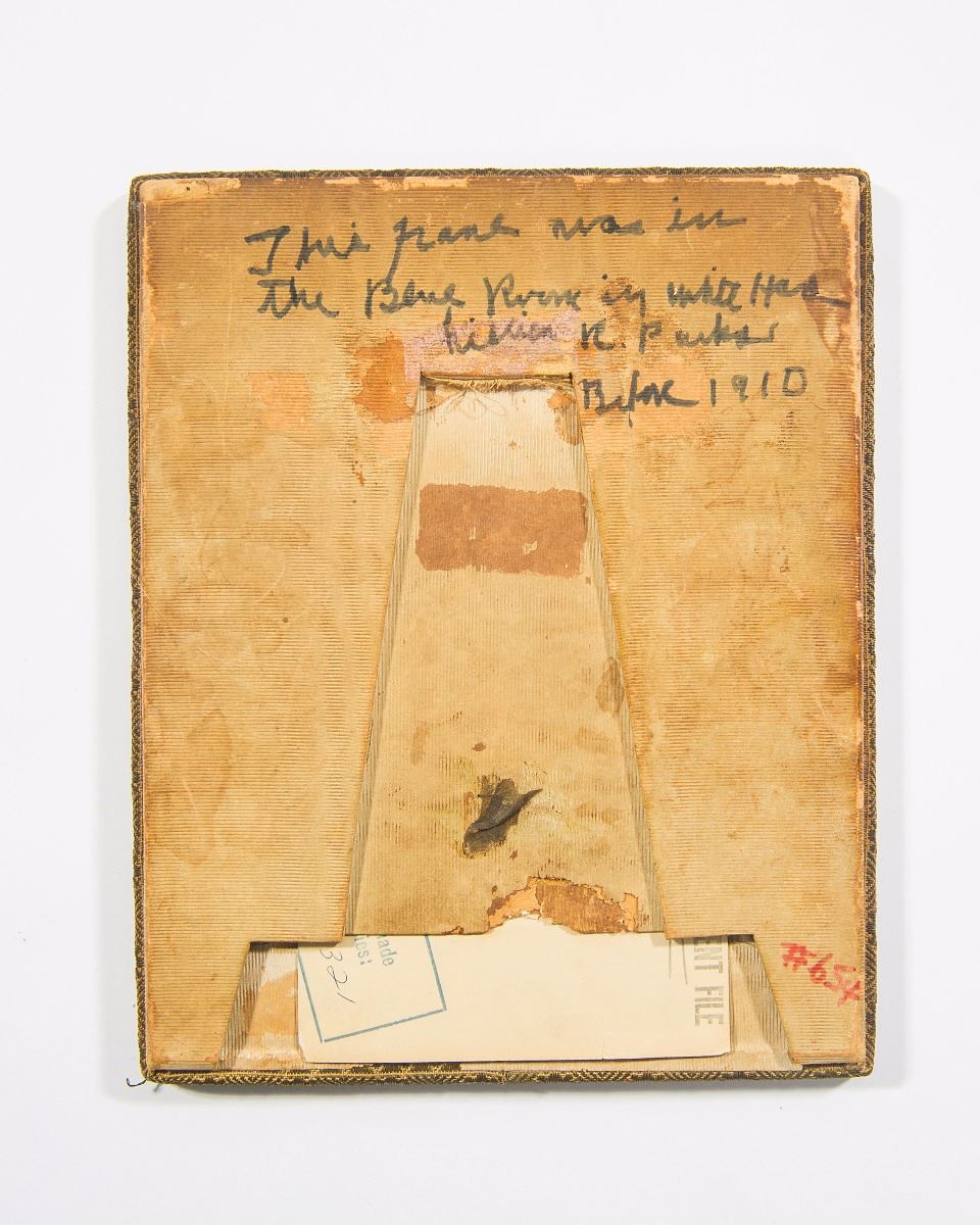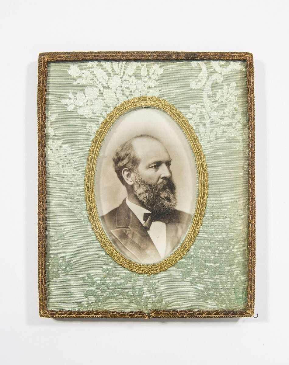 A lovely cloth-edged 6.75 x 8.5 frame with a green cloth mat subtly decorated in a floral pattern, with an oval opening encircled by gold ribbon, displaying a photograph of President James A. Garfield. A statement of provenance has been written on the back of the frame by Lillian Rogers Parks, who was a best selling author as well as housekeeper and seamstress at the White House for over 30 years, from President Hoover through President Eisenhower. In full: “This frame was in the Blue Room in White House before 1910.” In addition to the provenance written directly on the item, there is also a hand-dated 1985 White House card from Lillian Rogers Parks sharing additional historic details. A significant offering—straight from the White House. From the Raleigh DeGeer Amyx Collection.