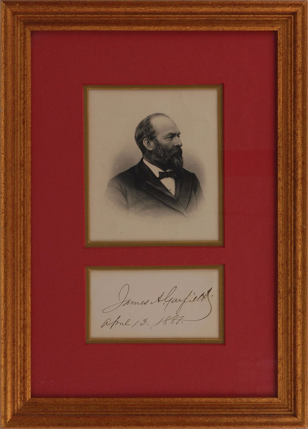 Bold ink signature as president, "James A. Garfield, April 13, 1881," on an off-white 4.5 x 2.5 slip. Handsomely double-matted and framed with an engraved portrait to an overall size of 11 x 16. In fine condition.