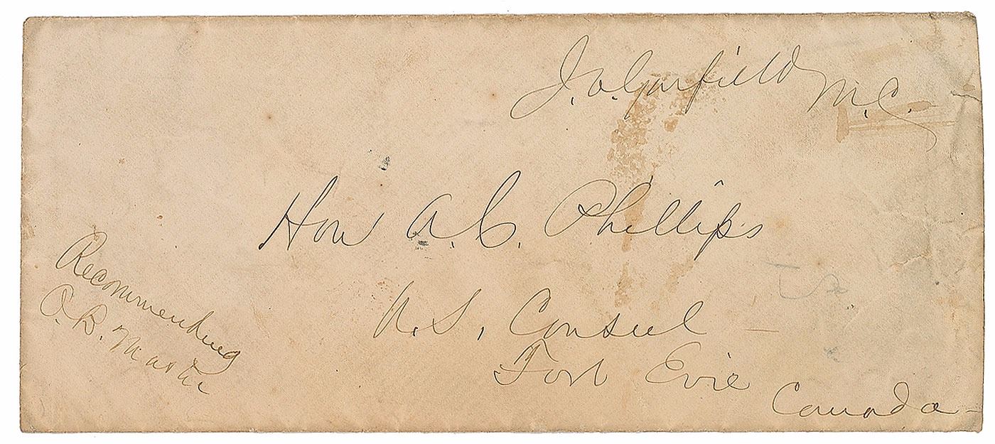 Free franked mailing envelope, 8.5 x 3.75, addressed in Garfield's hand to "Hon. A. C. Phillips, U. S. Consul, Fort Erie, Canada," and franked in the upper right, "J. A. Garfield, M. C." In very good condition, with moderate overall creasing, soiling, and some old adhesive residue touching the signature.