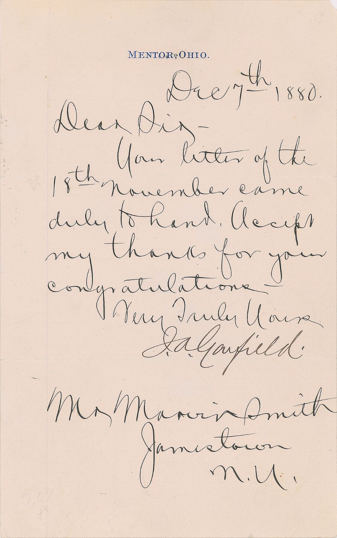 LS as president-elect, signed “J. A. Garfield,” one page, 5 x 8, Mentor, Ohio letterhead, December 7, 1880. Letter to Marvin Smith of Jamestown, New York, in full: "Your letter of the 18th November came duly to hand. Accept my thanks for your congratulations." Includes a 4.25 x 6.5 cabinet portrait of Garfield, published by F. Trifet of Boston. In fine condition. Taking place on November 2, 1880, the presidential election saw Garfield win a decisive victory over Winfield Scott Hancock in the electoral vote despite a miniscule lead in the popular vote. Garfield’s win marked the sixth consecutive victory in the presidential election for the Republican Party, its longest winning streak in history. A handsome letter signed a month after the historic contest.