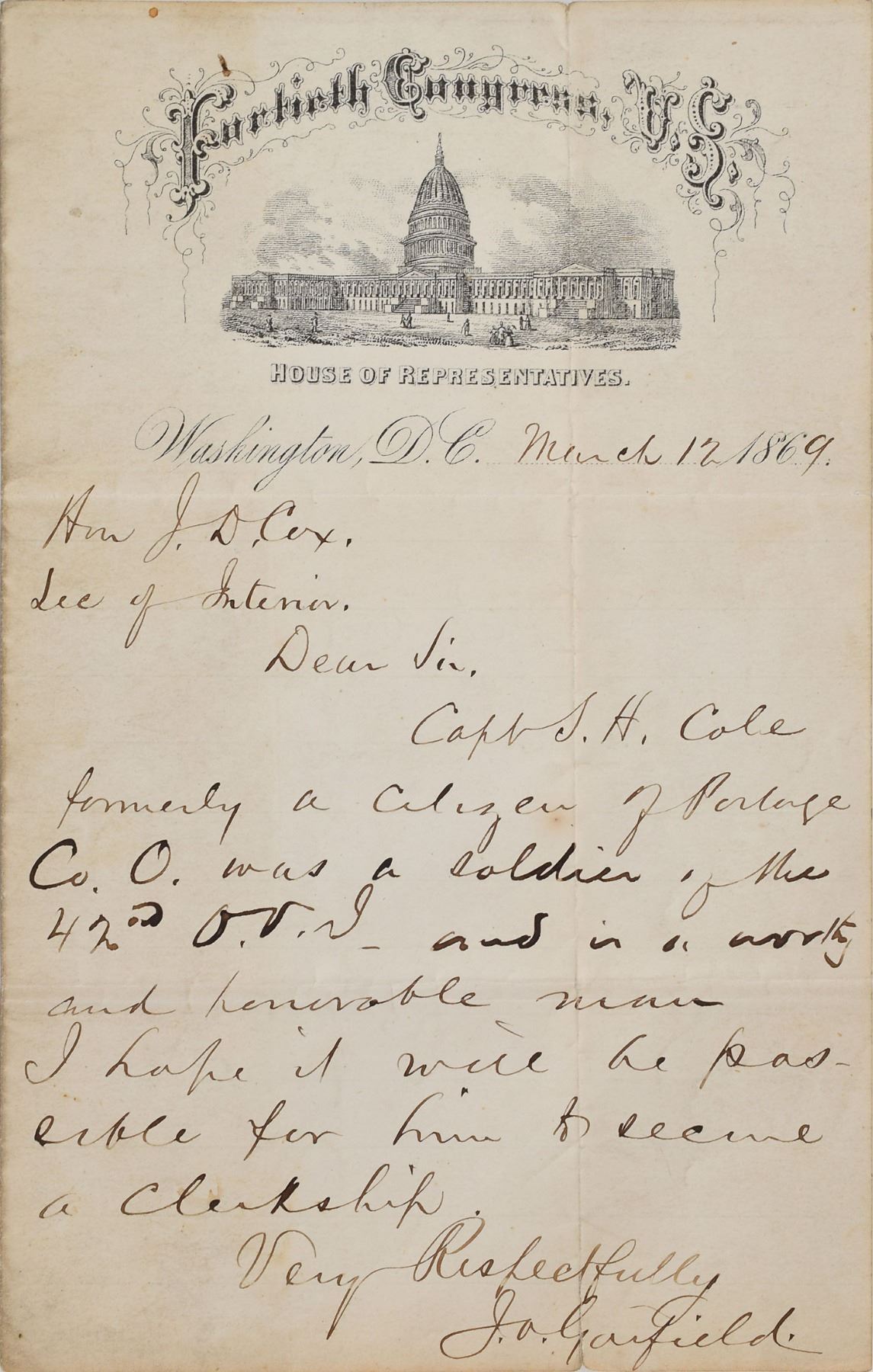 ALS signed “J. A. Garfield,” one page, 5 x 7.75, Fortieth Congress, US House of Representatives letterhead, March 12, 1869. Letter to Secretary of the Interior Jacob Dolson Cox, in part: "Capt. S. H. Cole formerly a citizen of Portage Co. O. was a soldier of the 42nd O. V. I., and is a worthy and honorable man. I hope it will be possible for him to secure a clerkship." In very good to fine condition, with light soiling, and a fold split passing through the first letter of Garfield's last name. Accompanied by a series of six letters and documents related to Cole, including: a letter from Garfield to Cole in the hand of an adjutant, stating that he has been detailed for guard duty; an 1862 letter by Benjamin Piatt Runkle to Cole on "Head-Quarters Buckeye Regiment, 45th Ohio" letterhead; an 1862 letter by Capt. Miles Payne to Cole, ordering him to "take every Negro man within one mile…and report him in person…said Negroes to be used to build a stockade as a defence against the attacks of the enemy, and to be released to their masters as soon as said work is completed"; an 1865 letter from Lt. Col. J. C. Smith to Garfield, concerning S. H. Cole's leave of absence; an 1867 letter by Samuel H. Cole to Secretary of War Stanton; and general orders printed in 1885 by which Cole's service record was modified. Cole served in the 42nd Ohio Volunteer Infantry, commanded by Garfield, in 1861–1862, engaging in operations against Confederate guerillas and fighting at the Battle of Mill Creek. A fascinating lot relevant to the Civil War.