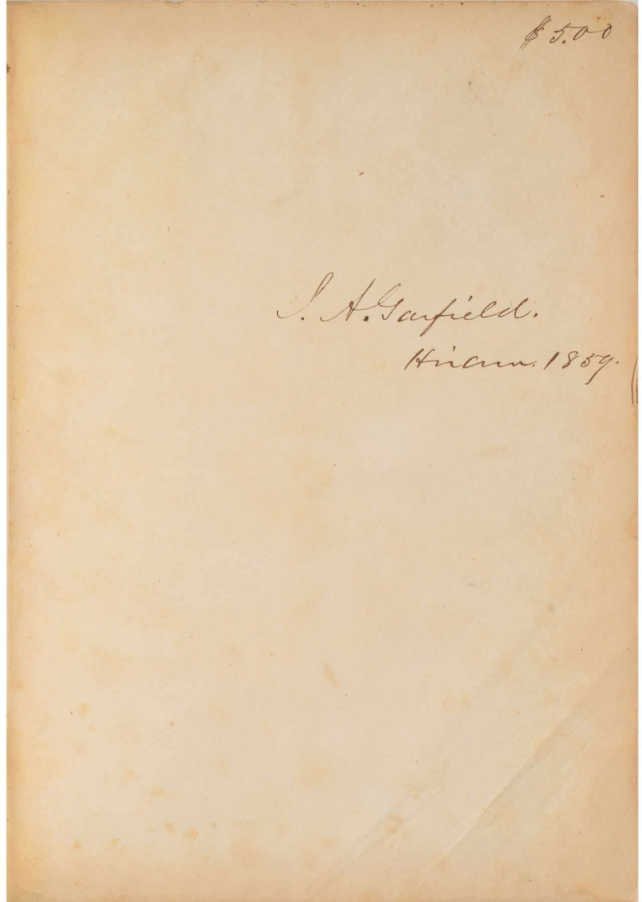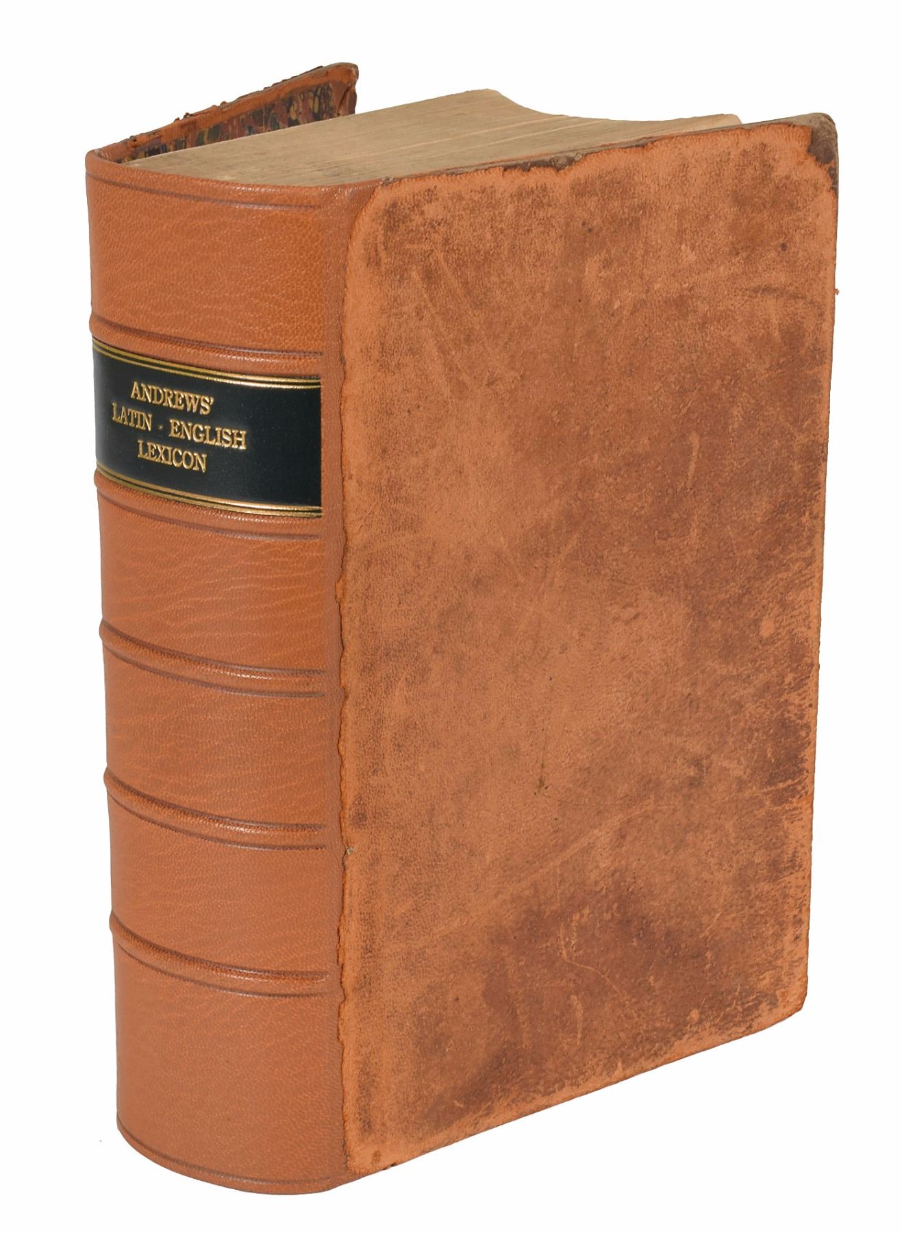 Signed book: A Copious and Critical Latin-English Lexicon by E. A. Andrews. NY: Harper & Brothers, 1858. Leatherbound hardcover, 7.25 x 10.25, 1648 pages. Signed on a free end page in black ink, "J. A. Garfield, Hiram 1859." Garfield's personal bookplate, "Inter Folia Fructus, Library of James A. Garfield," is affixed to the front pastedown. Autographic condition: fine, with scattered light toning. Book condition: restored to VG/None, with edgewear to boards. Garfield had attended Hiram College from 1851 to 1854, where he was most interested in the study of Greek and Latin. In 1856, he returned to Hiram as a teacher, and was named the college's president in 1857. A superb personally-owned book from early in Garfield's professional career.