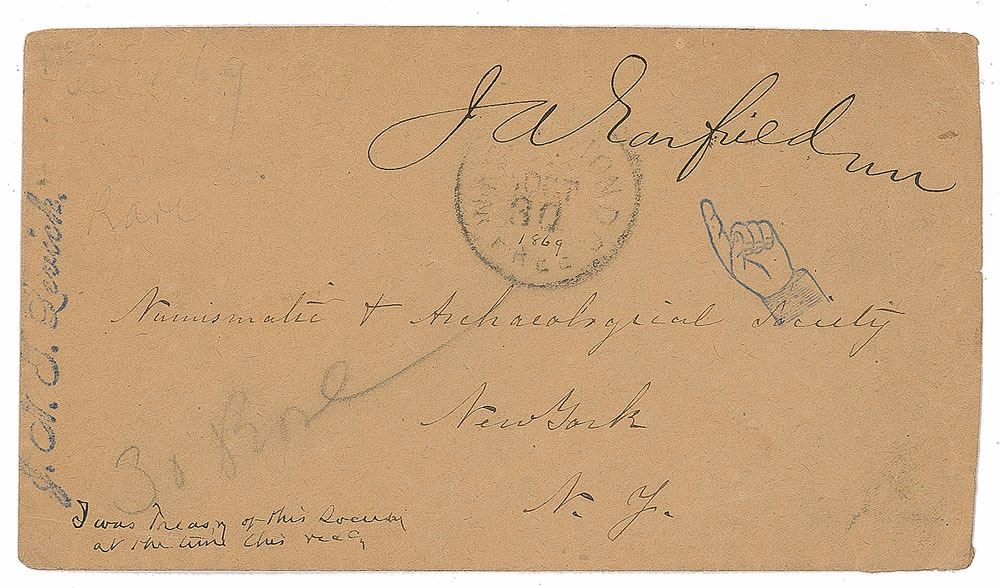 Uncommon free franked mailing envelope, 5.5 x 3, postmarked October 30 [1869], addressed in an unknown hand to the "Numismatic & Archaeological Society, New York, N.Y," and franked in the upper right, "J. A. Garfield mc." In fine condition.