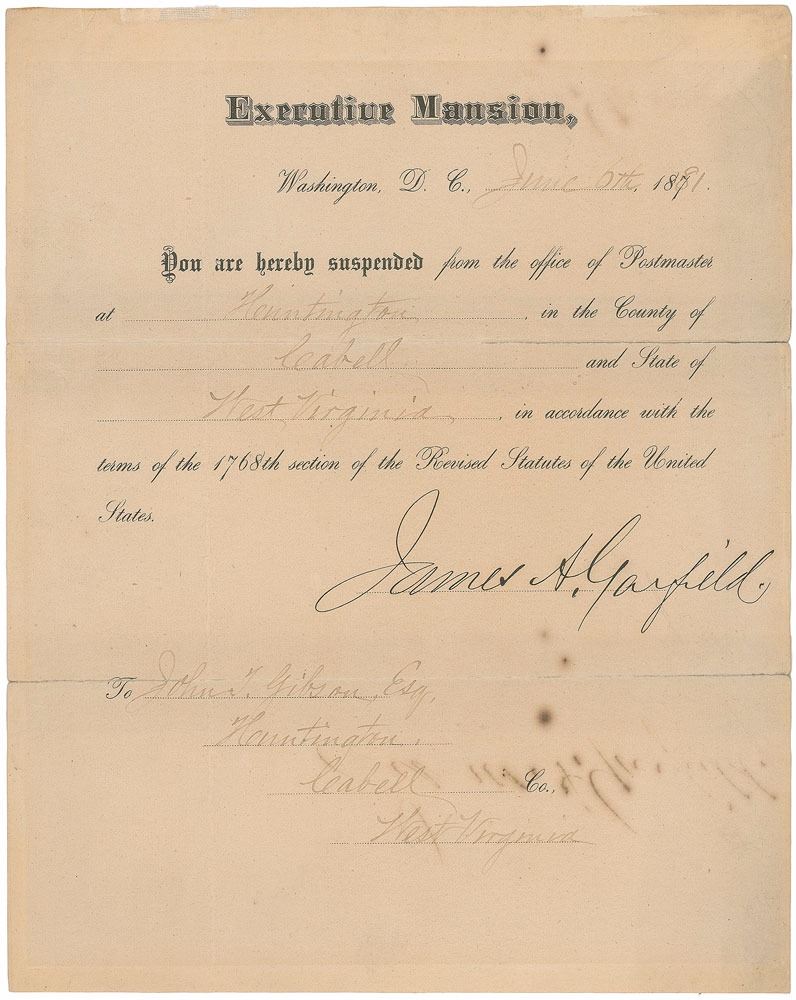 Rare partly-printed DS as president, one page, 8 x 10, June 6, 1881. Extremely rare document issued from the Executive Mansion, suspending John T. Gibson from his postmaster position. In full: "You are hereby suspended from the office of Postmaster at Huntington, in the County of Cabell and State of West Virginia, in accordance with the terms of the 1768th section of the Revised Statutes of the United States." Beautifully signed at the conclusion in bold black ink by President Garfield. In very good to fine condition, with splitting along horizontal folds reinforced with old tape on the reverse, a few small spots of foxing, and partial mirroring of Garfield's signature from premature folding.