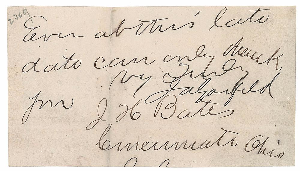 Ink signature, "Vy Truly, J. A. Garfield,” on an off-white 5 x 2.75 sheet clipped from the close of an apparently unrelated letter. In fine condition, with trimmed edges and light soiling along a vertical fold.