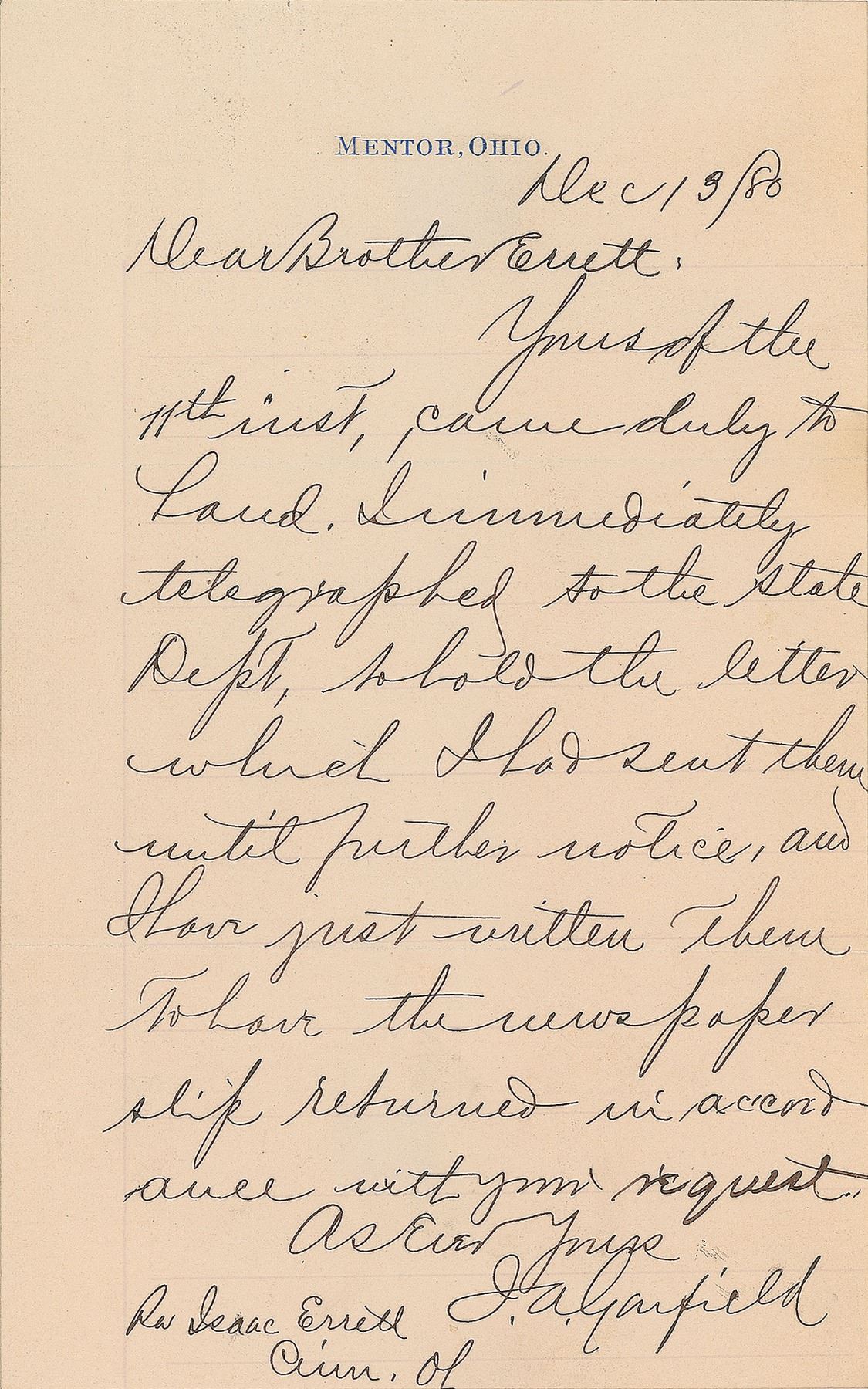 LS as president-elect, signed “J. A. Garfield,” one page, 5 x 8, Mentor, Ohio letterhead, December 13, 1880. Letter to noted Disciples of Christ clergyman Isaac Errett, in full: "Yours of the 11th inst, came duly to hand. I immediately telegraphed to the state Dept, to hold the letter which I had sent them until further notice, and I have just written them to have the newspaper slip returned in accordance with your request." In fine condition. Accompanied by an unsigned matte-finish photo. Garfield had been elected to the presidency on November 2, 1880, and would take office on March 4, 1881. Reverend Errett was a longtime friend of Garfield and delivered the eulogy at the fallen president's funeral in Cleveland on September 26, 1881.