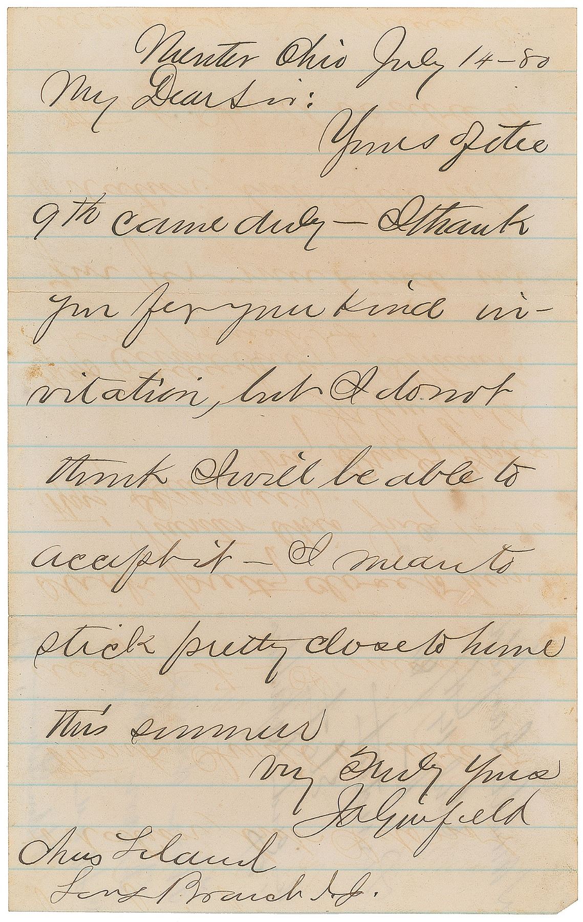 ALS signed “J. A. Garfield,” one page, 5.25 x 8.25, July 14, 1880. Letter to Charles Leland, in full: "Yours of the 9th came duly—I thank you for your kind invitation, but I don't think I will be able to accept it—I mean to stick pretty close to home this summer." Includes a Western Union Telegraph, addressed to Charles Leland, November 8, 1880, filled out and signed by a clerk on behalf of Garfield. In very good to fine condition, with splitting along horizontal folds, and light overall offsetting to the ink. Accompanied by an engraving of Garfield bearing a preprinted signature.