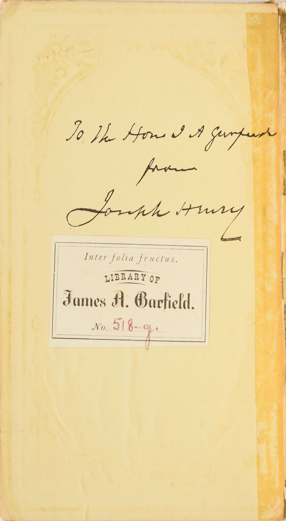 Signed book: A Rudimentary Treatise on the History, Construction, and Illumination of Lighthouses by Alan Stevenson. London: John Weale, 1850. Hardcover, 4.5 x 7, 204 pages. Signed and inscribed inside the front cover in ink, "To the Hon. J. A. Garfield, from Joseph Henry." Garfield's personal bookplate, "Inter Folia Fructus, Library of James A. Garfield," is affixed below the inscription. Autographic condition: very good to fine, with clear tape passing over the end of Garfield's last name in the inscription. Book condition: G+/None, with the binding crudely repaired with tape, tape repairs to hinges, and the textblock mostly detached from the spine. Congress created the Lighthouse Board in 1852 to improve nautical aids. Physicist Joseph Henry was appointed as a member of the new board and later served as its chairman; a pioneer in electromagnetism, Henry also served as first secretary of the Smithsonian Institution. A fantastic presentation copy from Garfield's personal library.