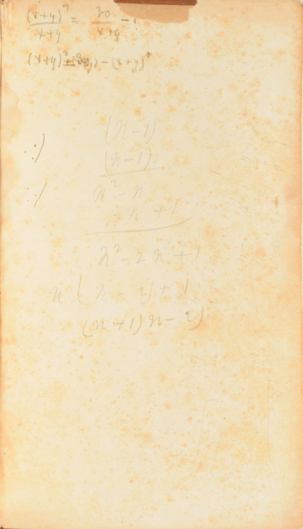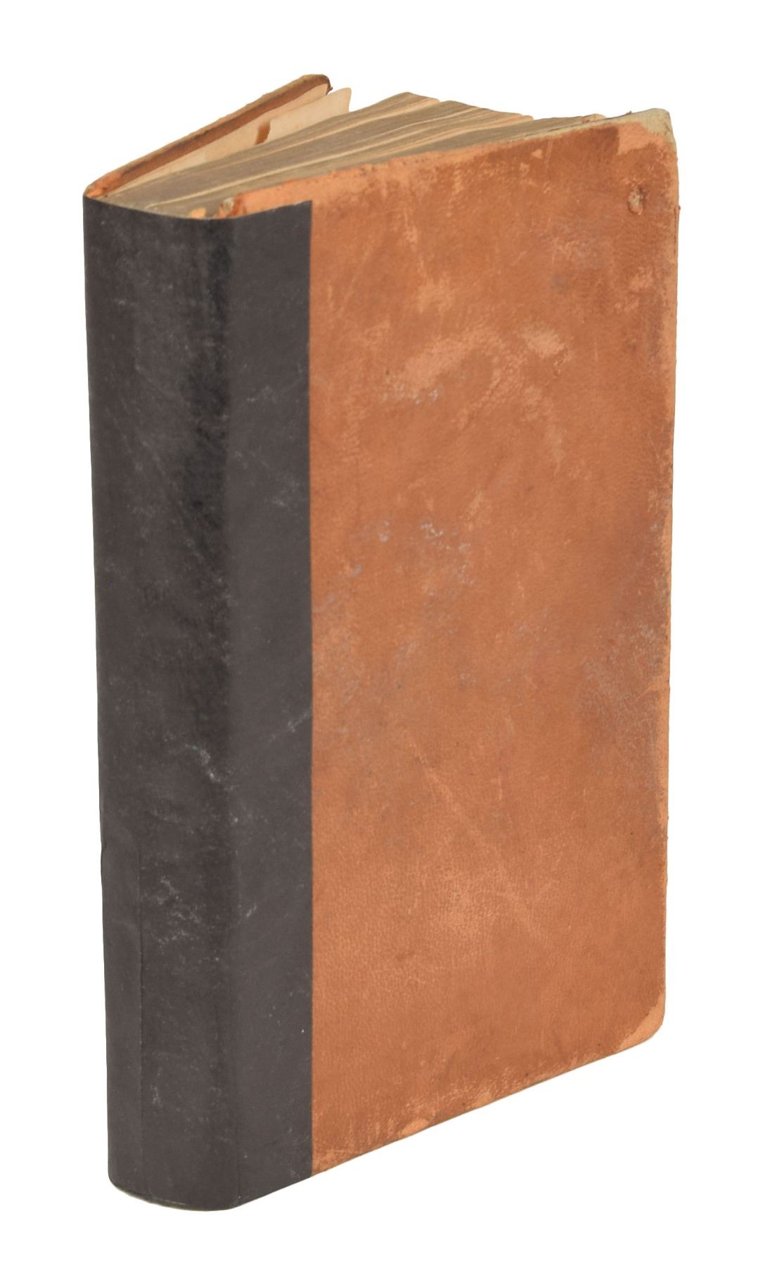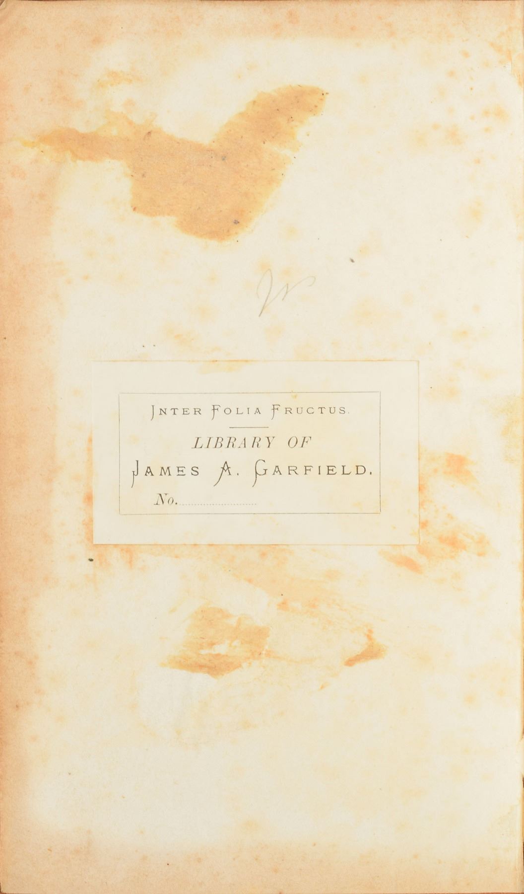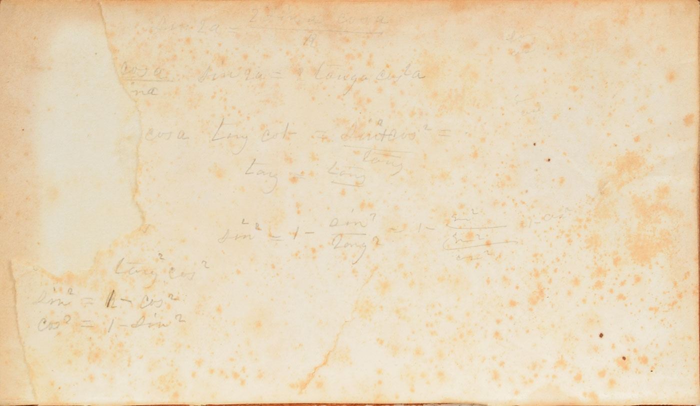 Annotated book: Ray's Algebra, Part Second: An Analytical Treatise, Designed for High Schools and Colleges. Stereotype edition. Cincinnati: W. B. Smith & Co., 1852. Leatherbound hardcover, 4.75 x 7.5, 396 pages. Opposite the title page, Garfield writes about seven equations using sine and cosine; Garfield's personal bookplate, "Inter Folia Fructus, Library of James A. Garfield," is affixed to the front pastedown. Autographic condition: very good, with heavy foxing, and the bottom of the first flyleaf torn off. Book condition: G+, with a tape-repaired spine, foxing to textblock, separation at front hinge, scuffing and soiling to exterior, and bumps to corners. Garfield attended the Western Reserve (Hiram) Eclectic Institute from 1851–1854, where he was known to be excellent in Latin and fairly adept at algebra, natural philosophy, and botany. A wonderful schoolbook from Garfield's college years.