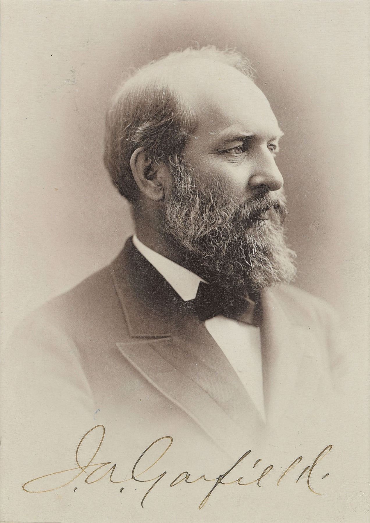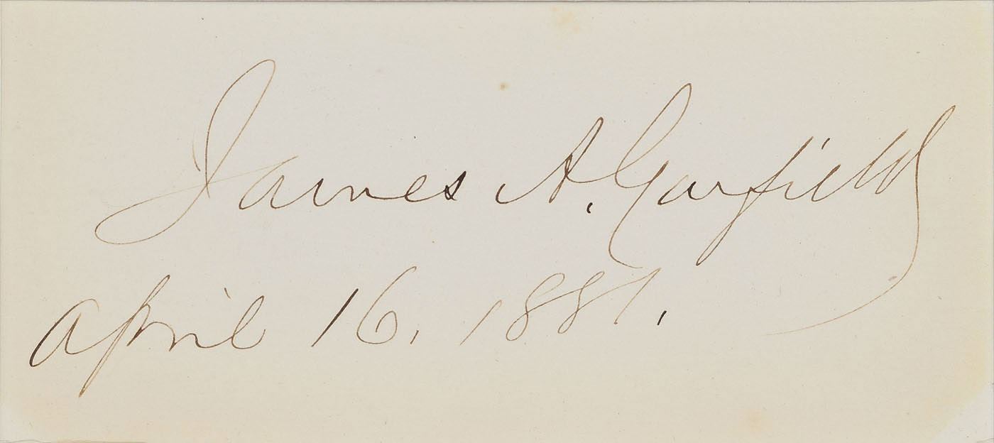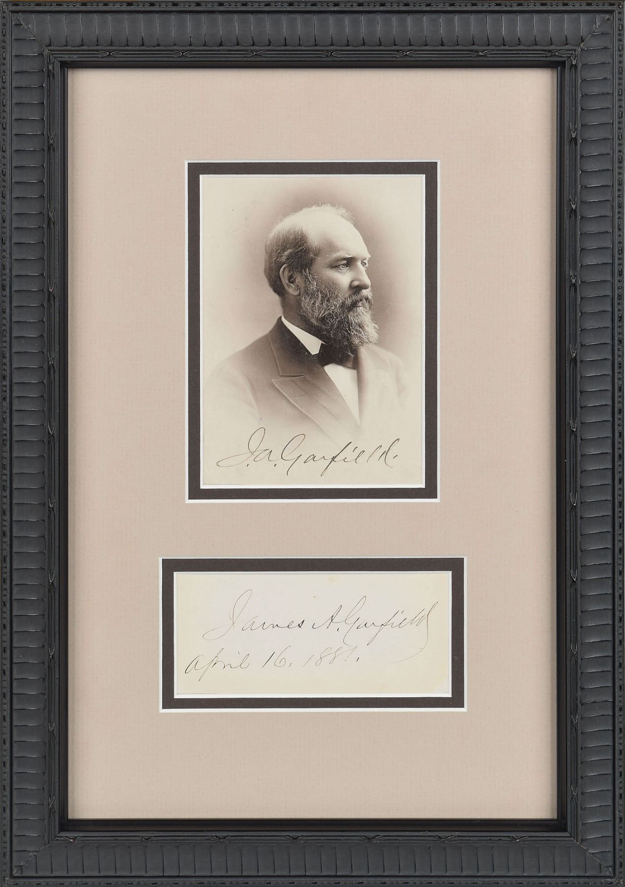 Two items: a stunning, crystal-clear 3.5 x 5 cabinet portrait of Garfield in a bust-length pose, neatly signed in black ink, "J. A. Garfield," with a circular Harroun & Bierstadt blindstamp in the lower right; and a large ink signature as president, "James A. Garfield, April 16, 1881," on an off-white 4.5 x 2 card. Both are double-matted and framed to an overall size of 10.25 x 14.75. In overall fine condition.