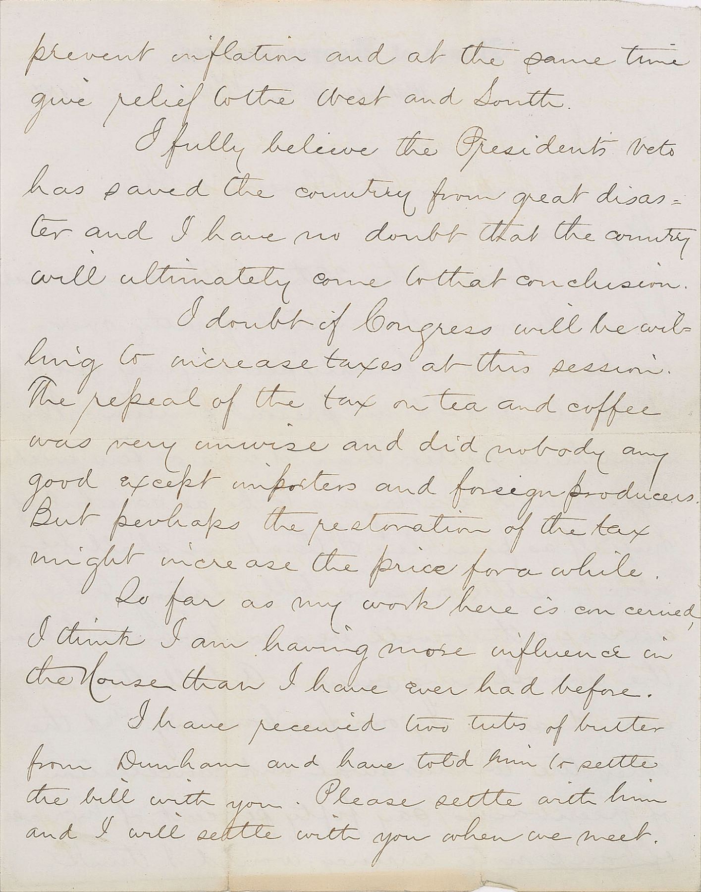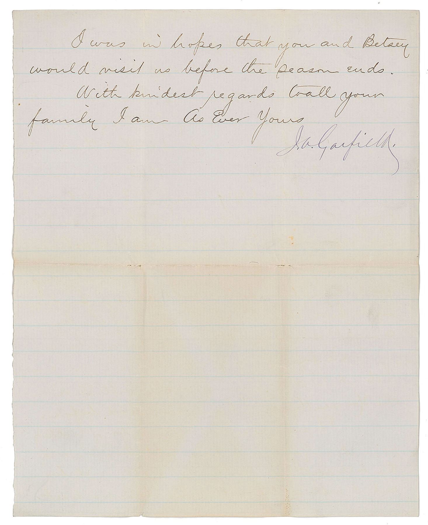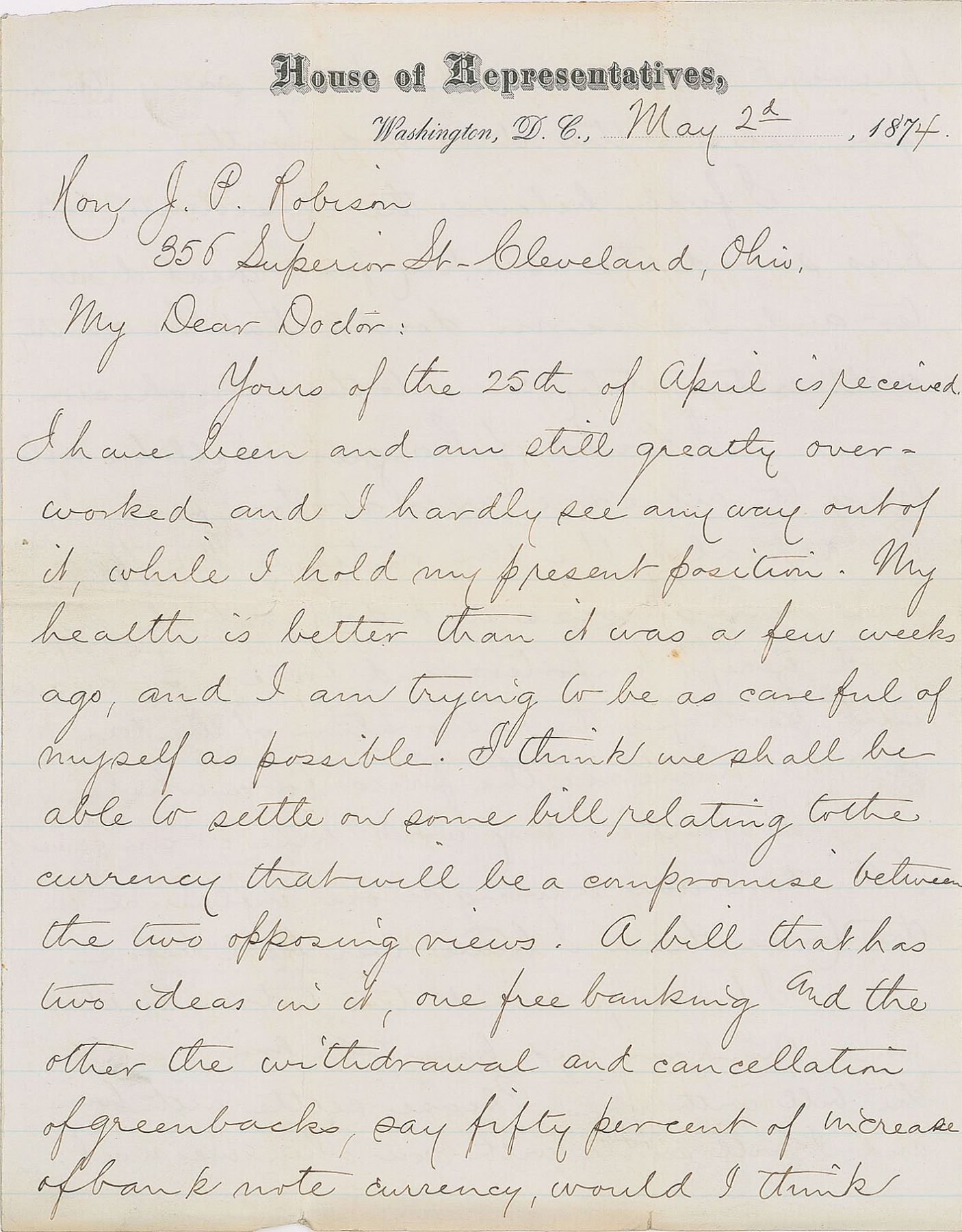 LS signed “J. A. Garfield,” three pages on two sheets, 7.5 x 9.5, House of Representatives letterhead, May 2, 1874. Letter to the Hon. John Peter Robison in Cleveland, in part: "I have been and am still greatly overworked and I hardly see any way out of it, while I hold my present position. My health is better than it was a few weeks ago, and I am trying to be as careful of myself as possible. I think we shall be able to settle on some bill relating to the currency that will be a compromise between the two opposing views. A bill that has two ideas in it, one free banking and the other the withdrawal and cancellation of greenbacks, say fifty percent of increase of bank note currency, would I think prevent inflation and at the same time give relief to the West and South. I fully believe the President's veto has saved the country from great disaster and I have no doubt that the country will ultimately come to that conclusion. I doubt if Congress will be willing to increase taxes at this session. The repeal of the tax on tea and coffee was very unwise and did nobody any good except importers and foreign producers. But perhaps the restoration of the tax might increase the price for a while. So far as my work here is concerned, I think I am having more influence in the House than I have had before." In very good to fine condition, with heavy intersecting folds.