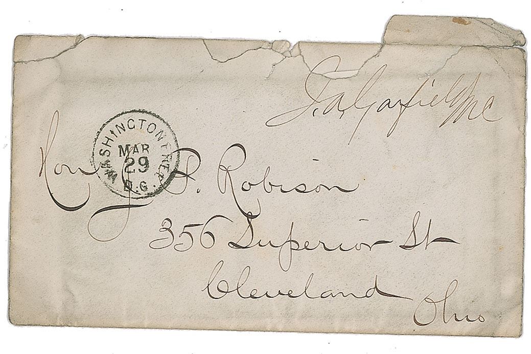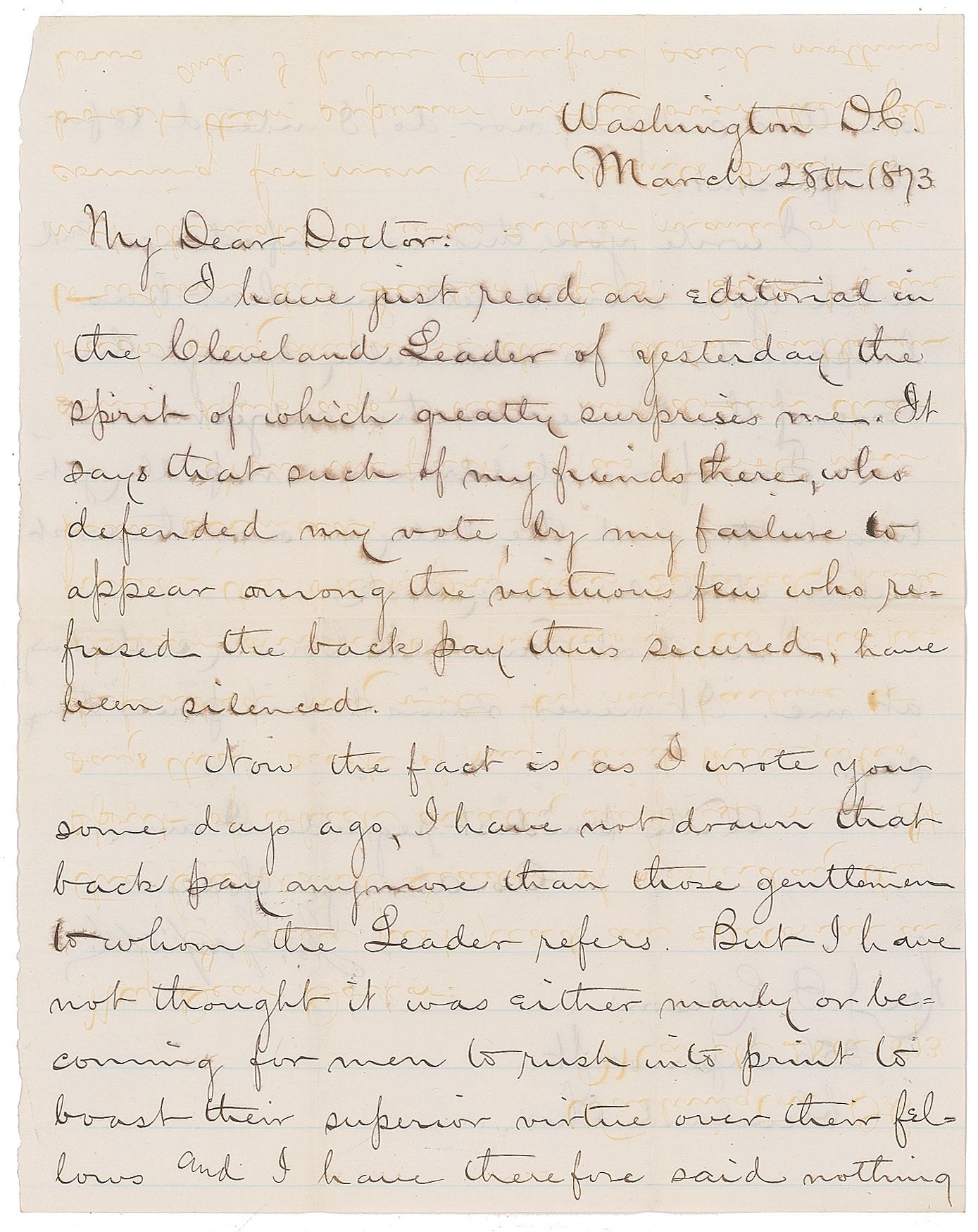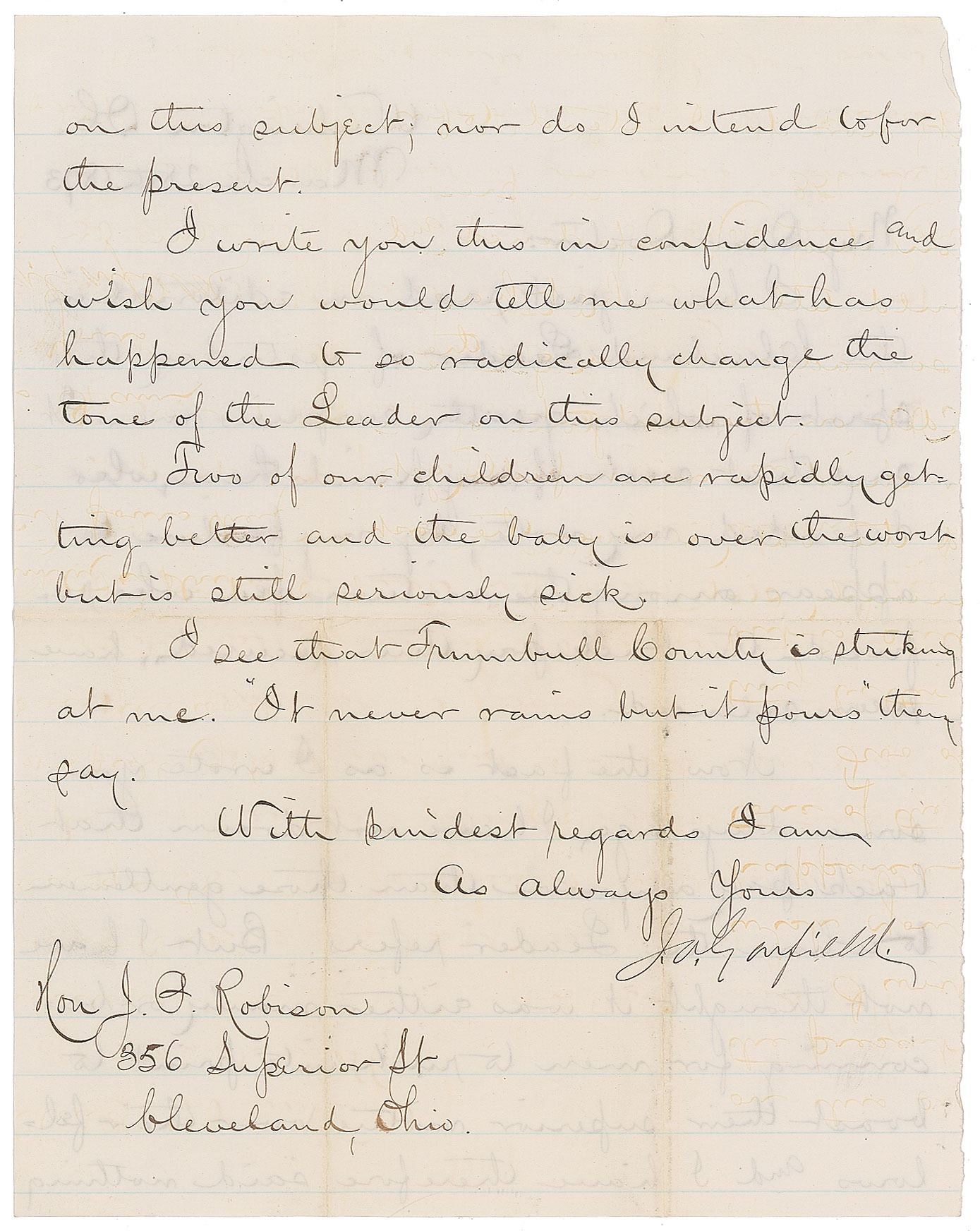LS signed “J. A. Garfield,” one page both sides, 7.75 x 9.75, March 28, 1873. Letter to the Hon. John Peter Robison in Cleveland, in part: "I have just read an editorial in the Cleveland Leader of yesterday the spirit of which greatly surprises me. It says that such of my friends there, who defended my vote, by my failure to appear among the virtuous few who refused the back pay thus secured, have been silenced. Now the fact is as I wrote you some days ago, I have not drawn that back pay any more than those gentlemen to whom the Leader refers. But I have not thought it was either manly or becoming for men to rush into print to boast their superior virtue over their fellows and I have therefore said nothing on this subject; nor do I intend to for the present. I write you this in confidence and wish you would tell me what has happened to so radically change the tone of the Leader on this subject. Two of our children are rapidly getting better and the baby is over the worst but still seriously sick. I see that Trumbull County is striking at me. 'It never rains but it pours' they say." Includes its original mailing envelope, franked in the upper right by Garfield, "J. A. Garfield, MC." In fine condition, with intersecting folds, and tear through the franking signature of the accompanying envelope.