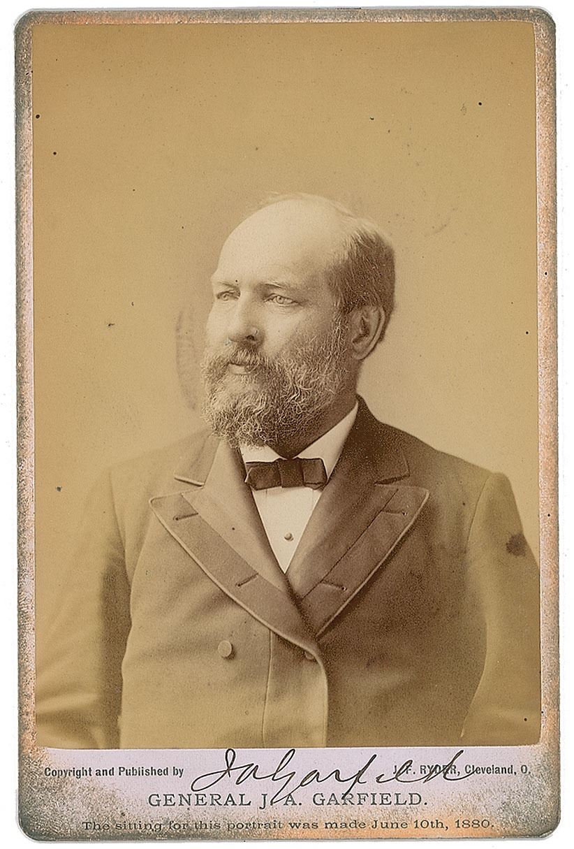 Magnificent 4.25 x 6.5 cabinet portrait of General James A. Garfield in a distinguished head-and-shoulders pose, signed in the lower border in black ink, "J. A. Garfield." Published by the J. F. Ryder Studio of Cleveland, Ohio, with caption to lower border reading: "The sitting for this portrait was made June 10th, 1880." In very good to fine condition, with a few blemishes to the image, and staining to the perimeter of the mount, not affecting the signature. The sitting for this photo occurred just two days after the conclusion of the 1880 Republican National Convention. Held at Chicago's Exposition Hall between June 2–8, the convention nominated Ohio Congressman James A. Garfield and Chester A. Arthur of New York as the official candidates of the Republican Party for President and Vice President, respectively, in the forthcoming presidential election.