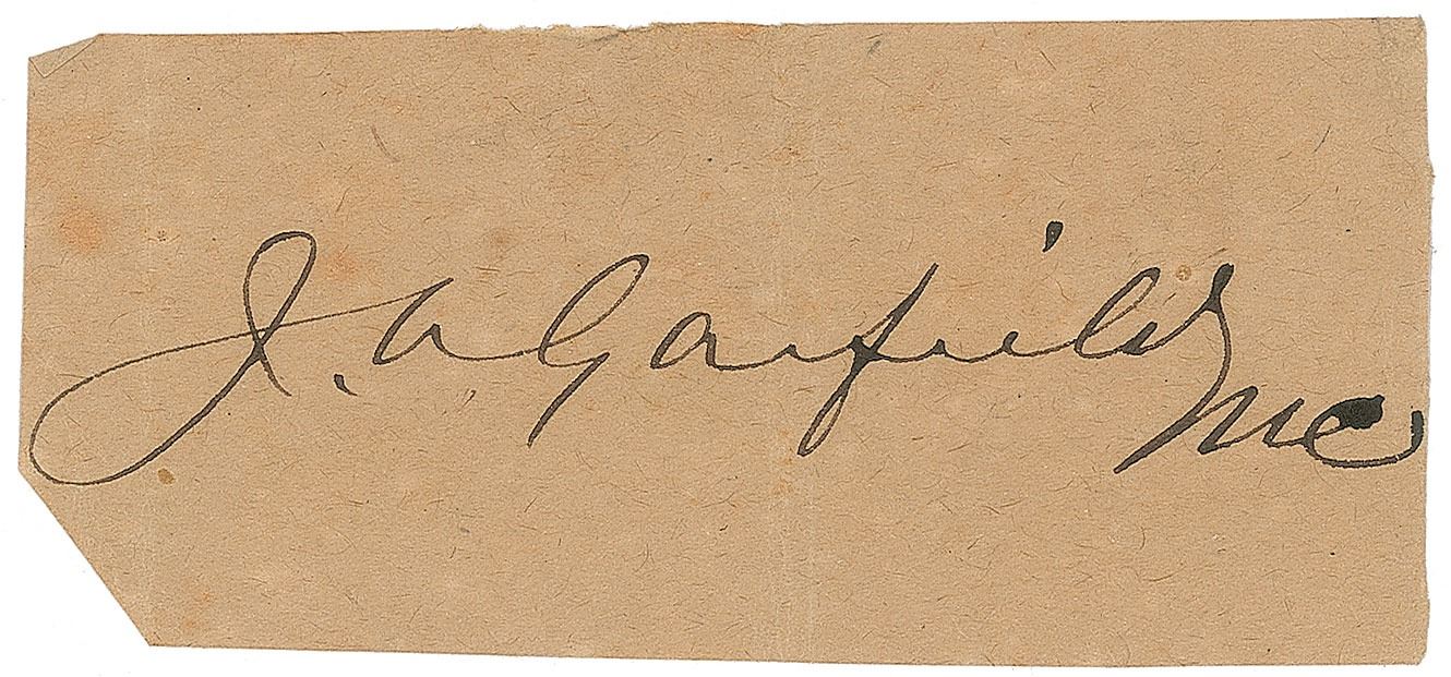 Bold ink signature, "J. A. Garfield, MC,” on an off-white 3.5 x 1.5 slip. In very good to fine condition, with a central vertical fold, lightly mottled toning, and a clipped lower left corner.
