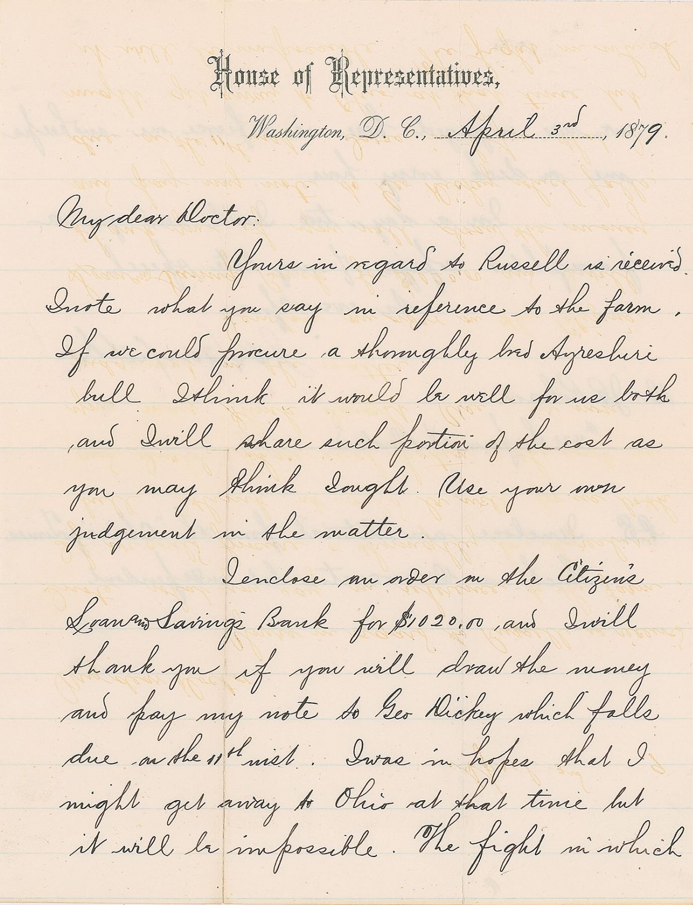 LS signed “J. A. Garfield,” one page both sides, 7.25 x 9.5, House of Representatives letterhead, April 3, 1879. Letter to Dr. John Peter Robison in Cleveland, in full: "Yours in regard to Russell is received. I note what you say in reference to the farm. If we could procure a thoroughly bred Ayreshire bull I think it would be well for us both, and I will share such portion of the cost as you may think I ought. Use your own judgement in the matter. I enclose and order on the Citizen's Loan and Savings Bank for $1020.00, and I will thank you if you will draw the money and pay my note to Geo. Dickey which falls due on the 11th inst. I was in hopes that I might get away to Ohio at that time but it will be impossible. The fight in which we are engaged here is a fierce one, and keeps me on deck every hour. In a day or two I will send you a pamphlet copy of my late speech…P.S. I enclose an editorial from the 'Chicago Times' which is Democratic but independent." In fine condition, with splitting to the bottom of one of the vertical folds.