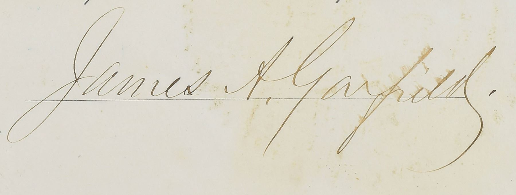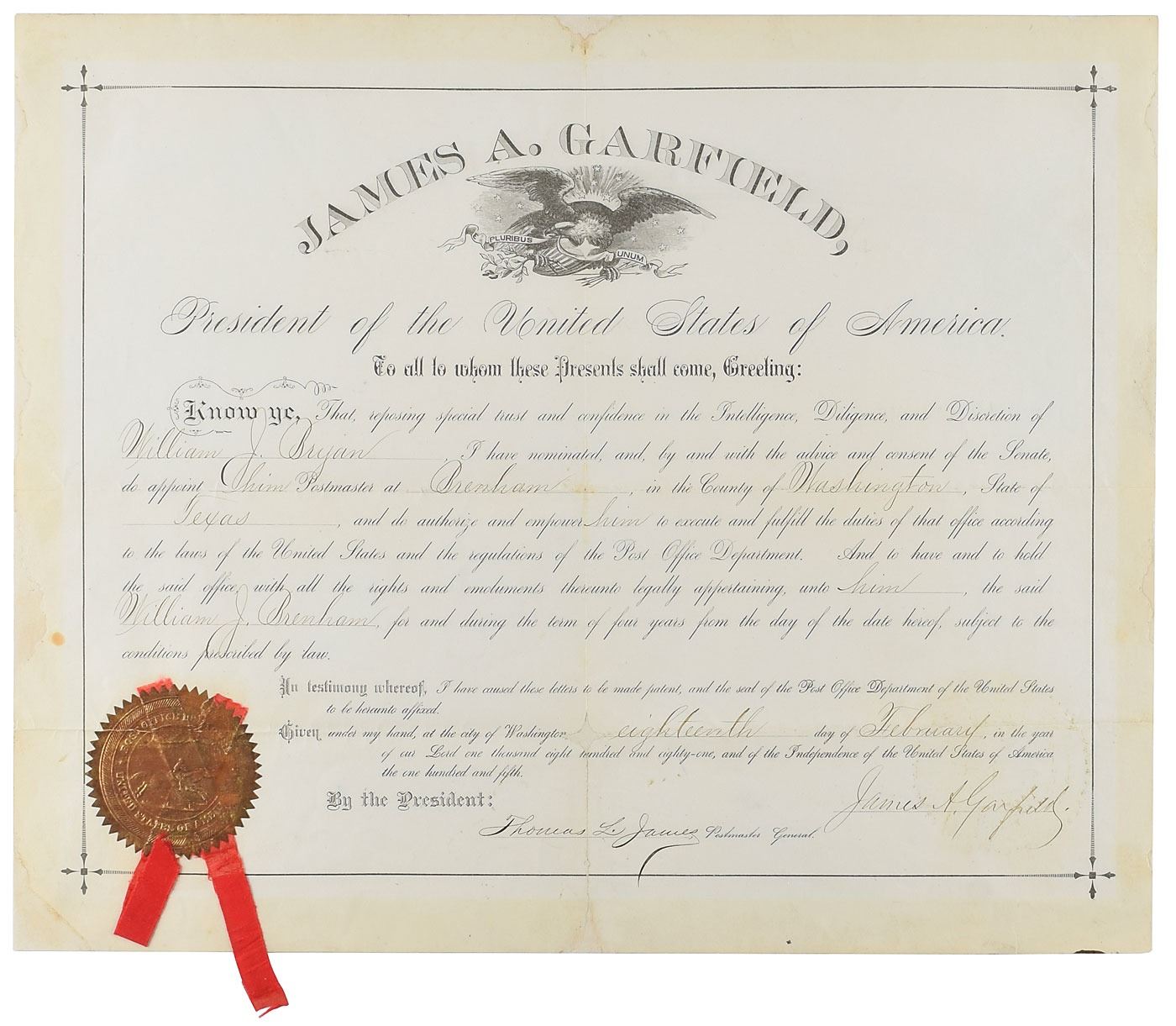 Partly-printed DS as president, one page, 17 x 14, February 18, 1881 [but actually signed between March 4 and July 2, 1881]. President Garfield appoints William J. Bryan as "Postmaster at Brenham, in the County of Washington, State of Texas." Crisply signed at the conclusion by President Garfield and countersigned by Postmaster General Thomas L. James. The gold seal and red ribbon affixed to the lower left remain intact. In very good to fine condition, with toning to the perimeter, and professional repairs to small areas of paper loss along the edges.