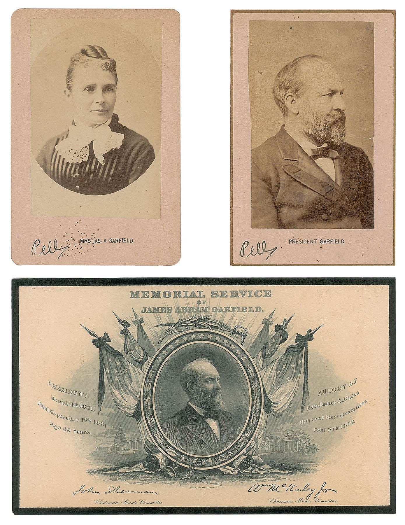 Three unsigned items: a black-bordered souvenir engraving from the Congressional memorial service for James A. Garfield held on February 27, 1882, produced by the Bureau of Engraving and Printing, 9.75 x 6, featuring an image of Garfield in a cartouche surrounded by American flags, laurels, a sword, the Capitol building, and the White House, and bearing the facsimile signatures of John Sherman and William McKinley (as Chairmen of the Senate and House Committees, respectively); and a pair of matching 4.25 x 6.5 cabinet card portraits of President James A. Garfield and First Lady Lucretia Garfield by Pell. In overall fine condition, with some small stains to the cabinet photos, and old mounting remnants to the back of all three items.