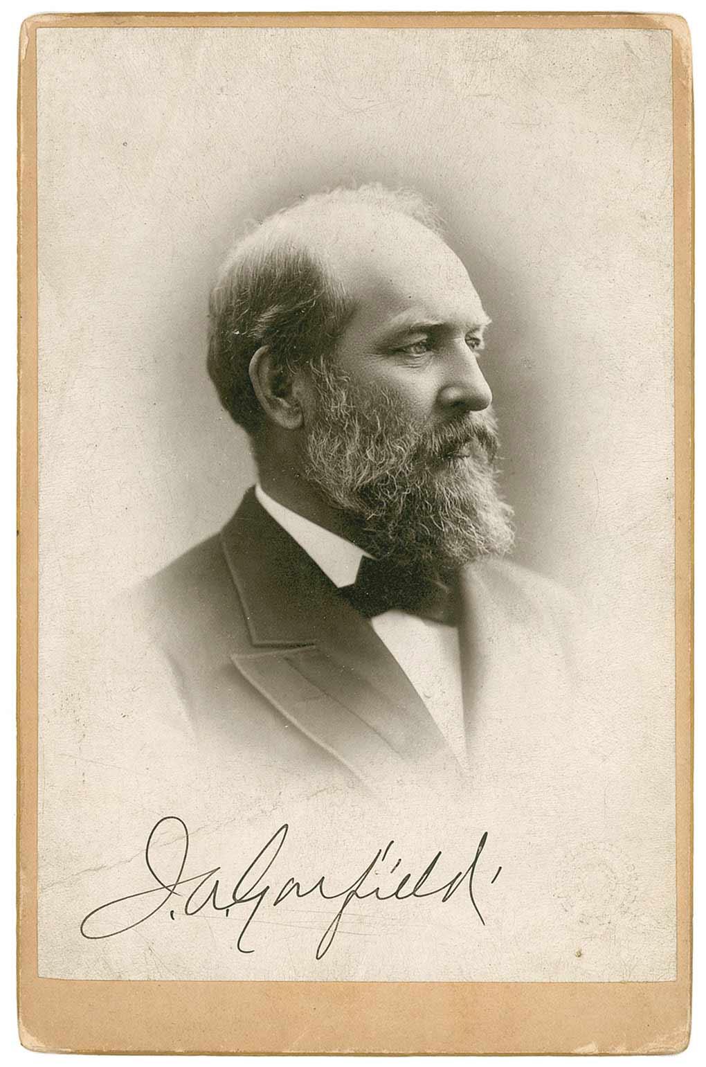 Stately vintage 4.25 x 6.5 cabinet photo, signed in ink, “J. A. Garfield.” The lower right of the image area carries the circular blindstamp, “Harroun & Bierstadt, Artotype, N.Y.,” which indicates that the original negative for this intense portrait was taken expressly for Bierstadt by photographer H. W. Tibbals. A faint crease passes through the “J” in Garfield’s first initial, and there is scattered light soiling and mild edge wear; otherwise fine condition.