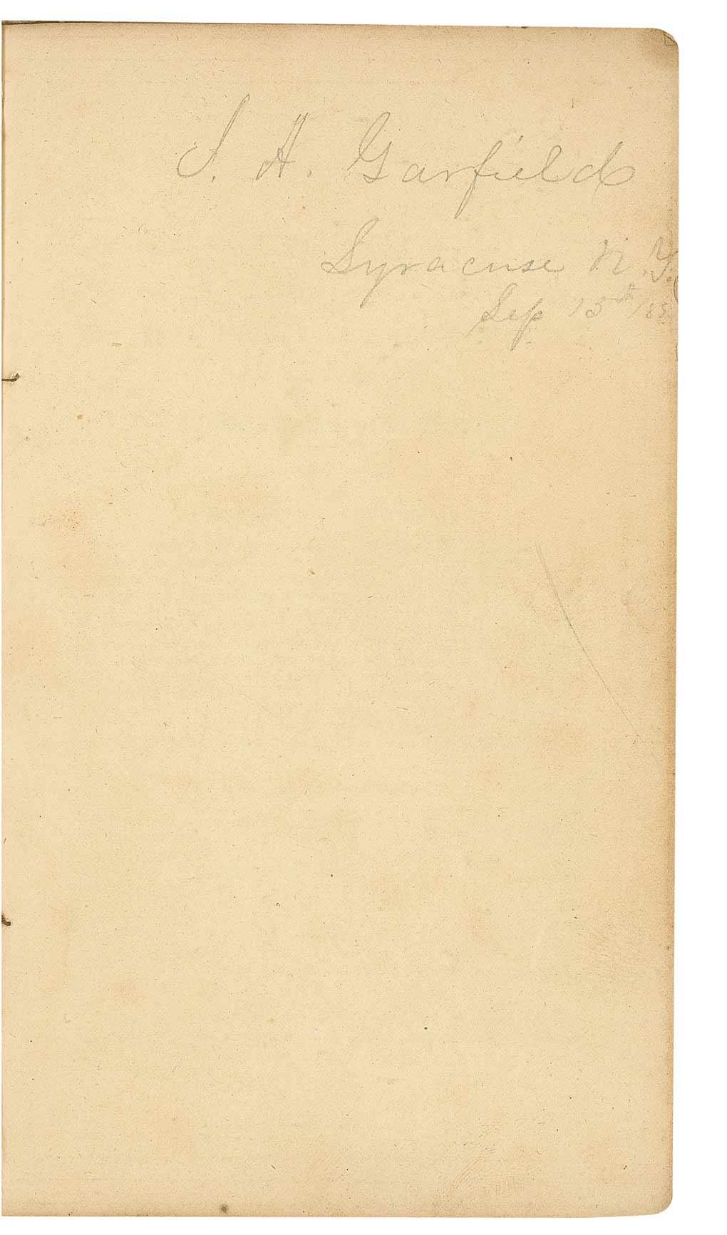 Over the past thirty years, only five Garfield signed books have ever been offered at major auctions. The book Collecting Books and Pamphlets of Presidents of the United States states that "books from Garfield's library are considered scarce," and what makes this particular example more fascinating is that it undoubtedly dates from Garfield's short-lived career as a schoolteacher (1856-1857). His library consisted of about 2,500 volumes, of which several dozen were deaccessioned. This particular volume was acquired directly from his home, “Lawnfield," in Mentor, Ohio.