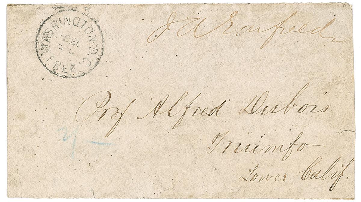 Free-franked envelope, 5 x 2.75, addressed in another hand to Professor Alfred Dubois, franked in the upper right, “J. A. Garfield.” In very good condition, with trimmed right edge, scattered toning and soiling, and Garfield’s signature a shade or two light, but completely legible. Pre-certified John Reznikoff/PSA/DNA and RRAuction COA.