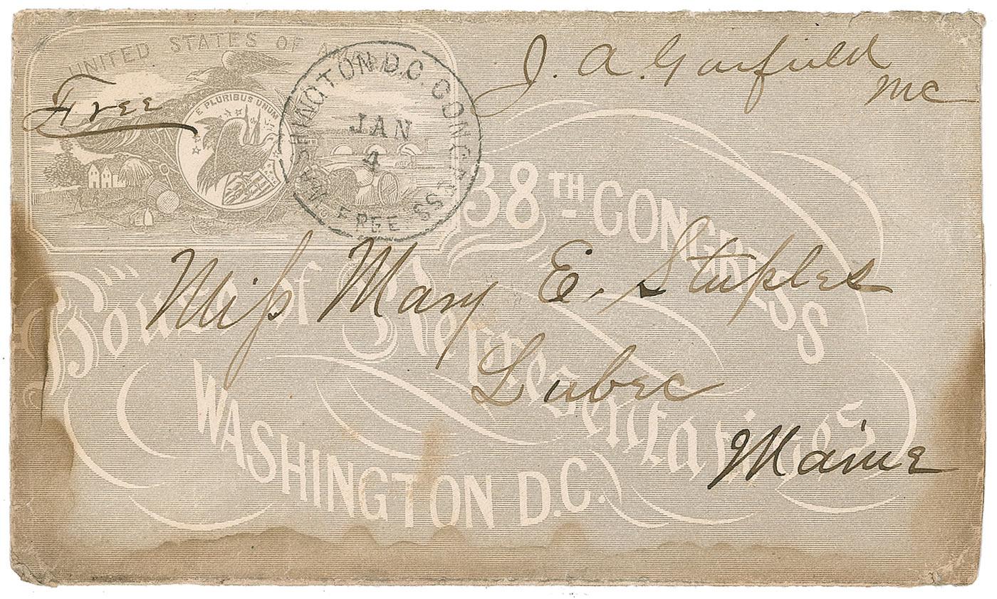 Unusual free-franked House of Representatives mailing envelope, 5.75 x 3.5, addressed in another hand to “Miss Mary E. Stuples, Lubec Maine,” and franked along the top, “J. A. Garfield, MC,” with “Free” written in another hand at left edge. In very good condition, with soiling and damp staining along three edges (not affecting signature), and some scattered light creasing. Pre-certified John Reznikoff/PSA/DNA and RRAuction COA.