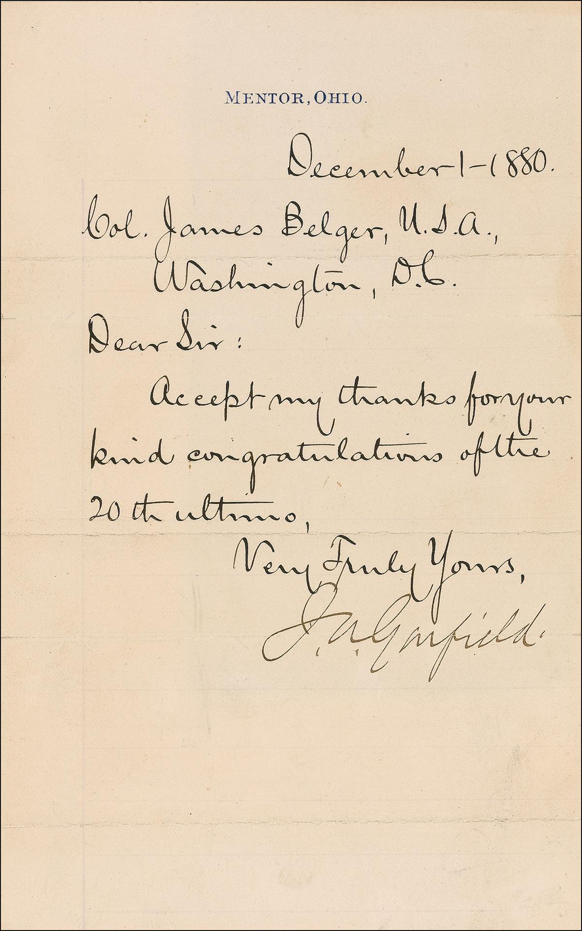 LS signed as president-elect, “J. A. Garfield,” one page, faintly-lined, 5 x 8, December 1, 1880. Letter to Colonel James Belger accepting thanks on his election to the presidency. In full: “Accept my thanks for your kind congratulations of the 20th ultimo.” Letter is archivally sleeved in acid-free Mylar. A couple extra horizontal folds, one through Garfield’s signature, and a bit of scattered light soiling, otherwise fine condition. Accompanied by the original mailing envelope.