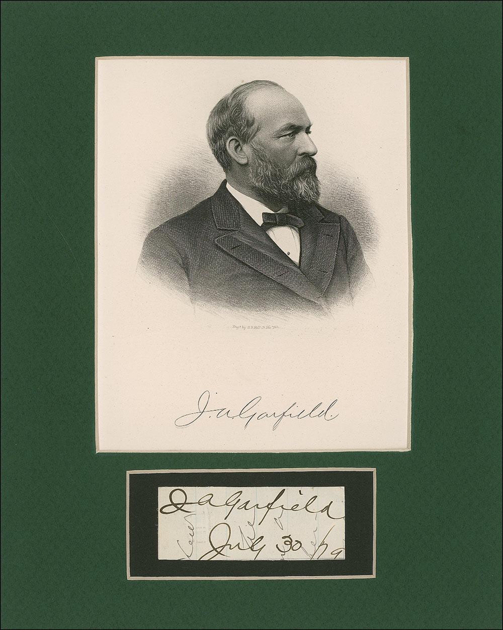 Ink signature, “J. A. Garfield, July 30/79,” on an off-white vertically-lined slip. Matted with an engraved portrait of Garfield to an overall size of 8 x 10. In fine condition, with light writing under Garfield’s signature.