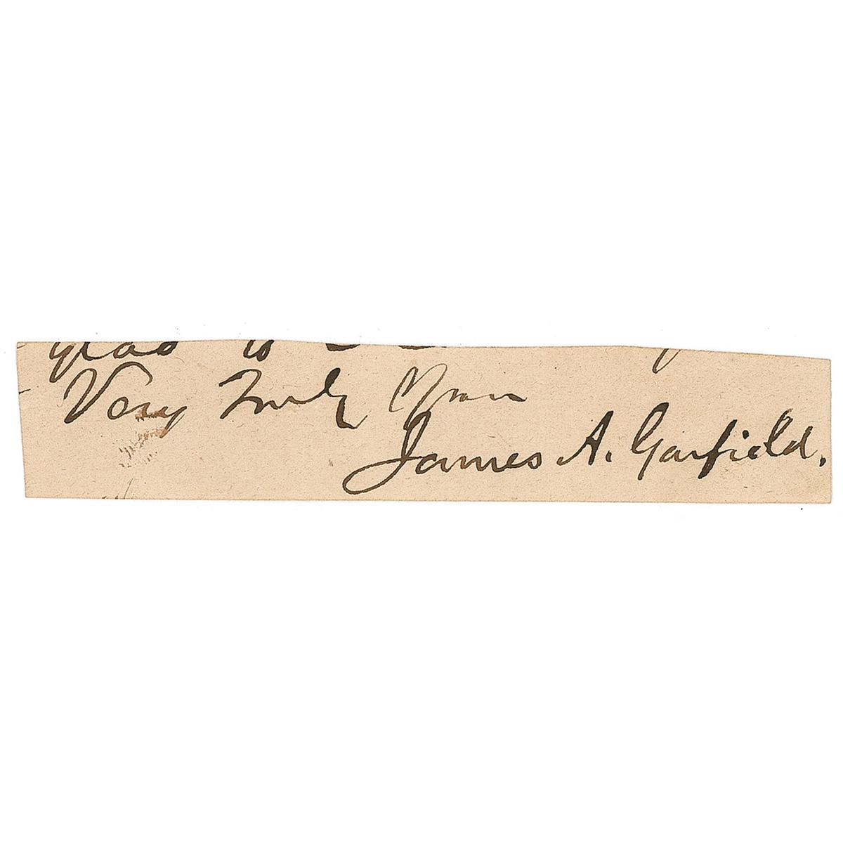 Ink signature, “James A. Garfield,” on an off-white 3.5 x .75 slip clipped from the closing of a letter. In fine condition, with several other words from conclusion of letter above signature.