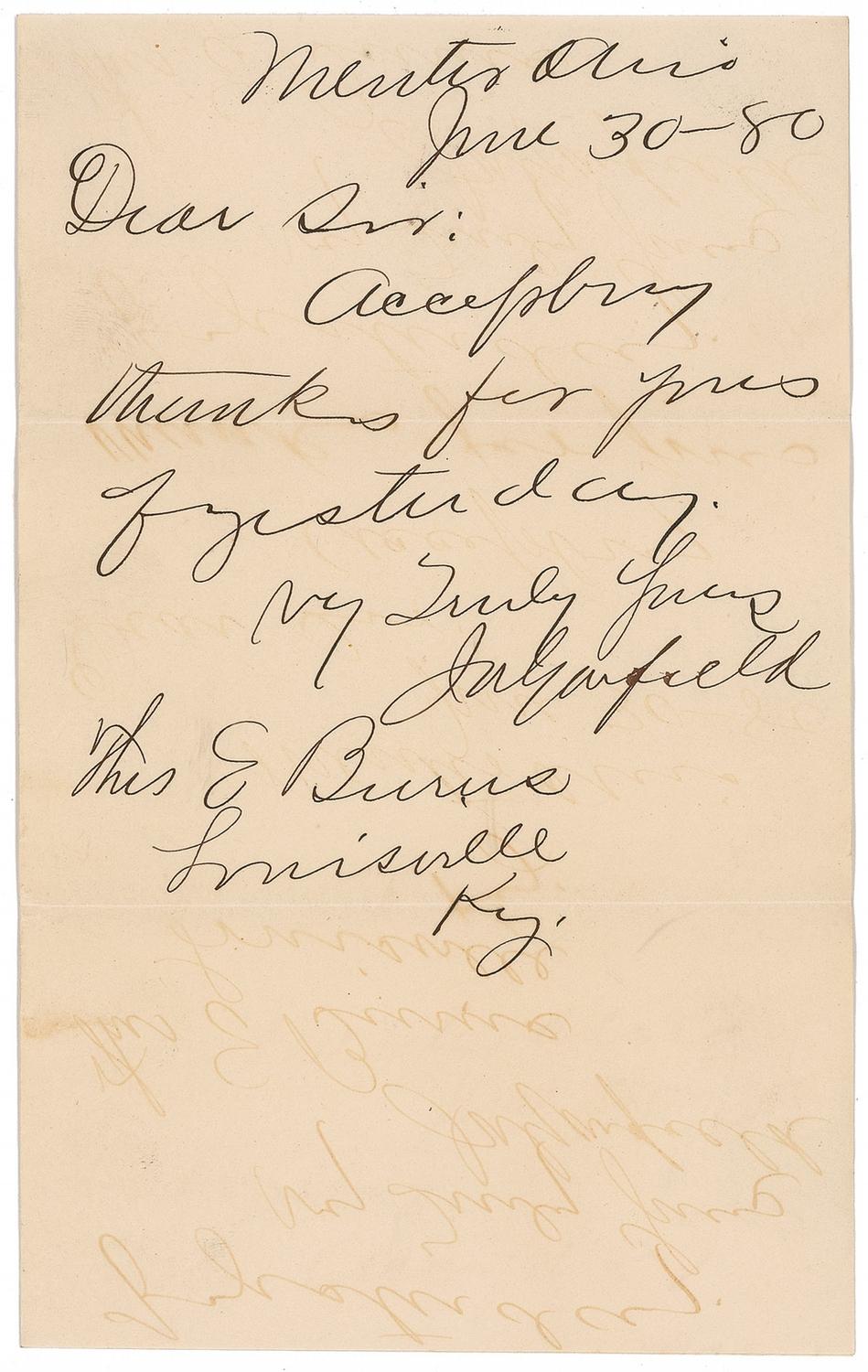 ALS signed “J. A. Garfield,” one page, 5.5 x 8, June 30, 1880. Brief letter of thanks to Thomas E. Burns for a previous letter. In full: “Accept my thanks for yours of yesterday.” In fine condition, with a uniform shade of toning, and light mirroring of text along bottom.