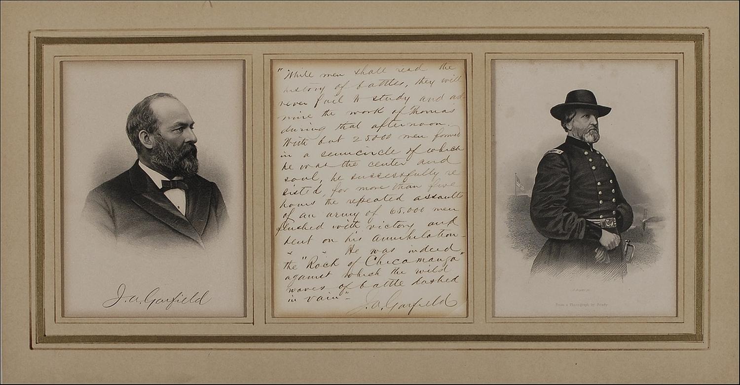 Manuscript quotation, signed “J. A. Garfield,” one page, 4.75 x 6.25. In full: “While men shall read the history of battles, they will never fail to study and admire the work of Thomas during that afternoon. With but 25,000 men formed in a semicircle of which he was the center and soul, he successfully resisted, for more than five hours the repeated assaults of an army of 65,000 men flushed with victory and bent on his annihilation. He was indeed the ‘Rock of Chicamauga [sic]’ against which the wild waves of battle lashed in vain.”