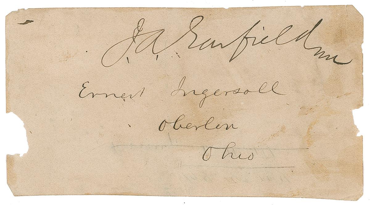 Free-franked address panel, 5 x 2.75, addressed in another hand to “Ernest Ingersoll, Oberlin, Ohio,” and franked at the top, “J. A. Garfield, mc.” In very good condition, with paper loss to both vertical edges, a vertical fold between second initial and last name, scattered toning, and show-through from notations on reverse.
