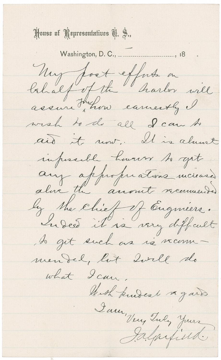 LS signed “J. A. Garfield,” one lightly-lined page, 5 x 8, House of Representatives letterhead, no date. Garfield, as an Ohio congressman, writes an unidentified recipient. In full: “My past efforts on behalf of the harbor will assure you how earnestly I wish to do all I can to aid it now. It is almost impossible however to get any appropriations increased above the amount recommended by the chief of Engineers. Indeed it is very difficult to get such as is recommended, but I will do what I can.” In fine condition, with intersecting folds (vertical fold is moderately heavy). The “chief of Engineers” is a reference to the commander of the US Army Corps of Engineers, the military command charged with public engineering, design, and construction management, as well as defining policy. As noted by Garfield, the chief engineer would have had significant input into funding for any harbor work. During his years in Congress, Garfield became an expert on financial matters by his involvement in several key committees, including serving as chairman of the Banking and Currency Committee, the Appropriations Committee, and the Military Affairs Committee, as well as being a member of the House Ways and Means Committee.