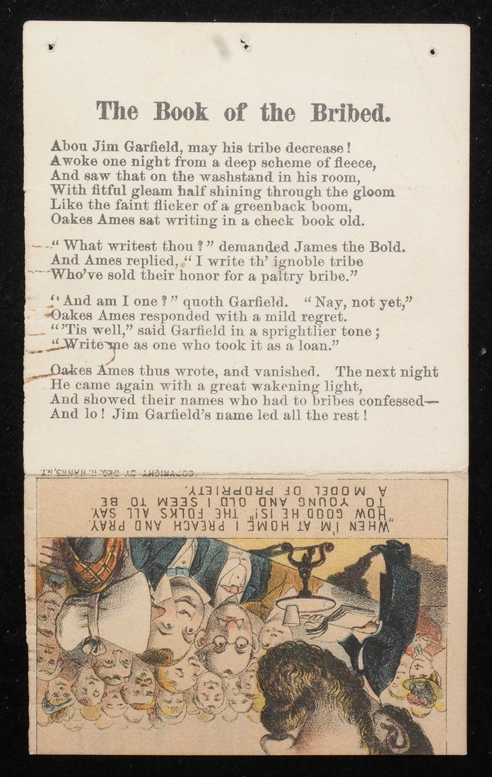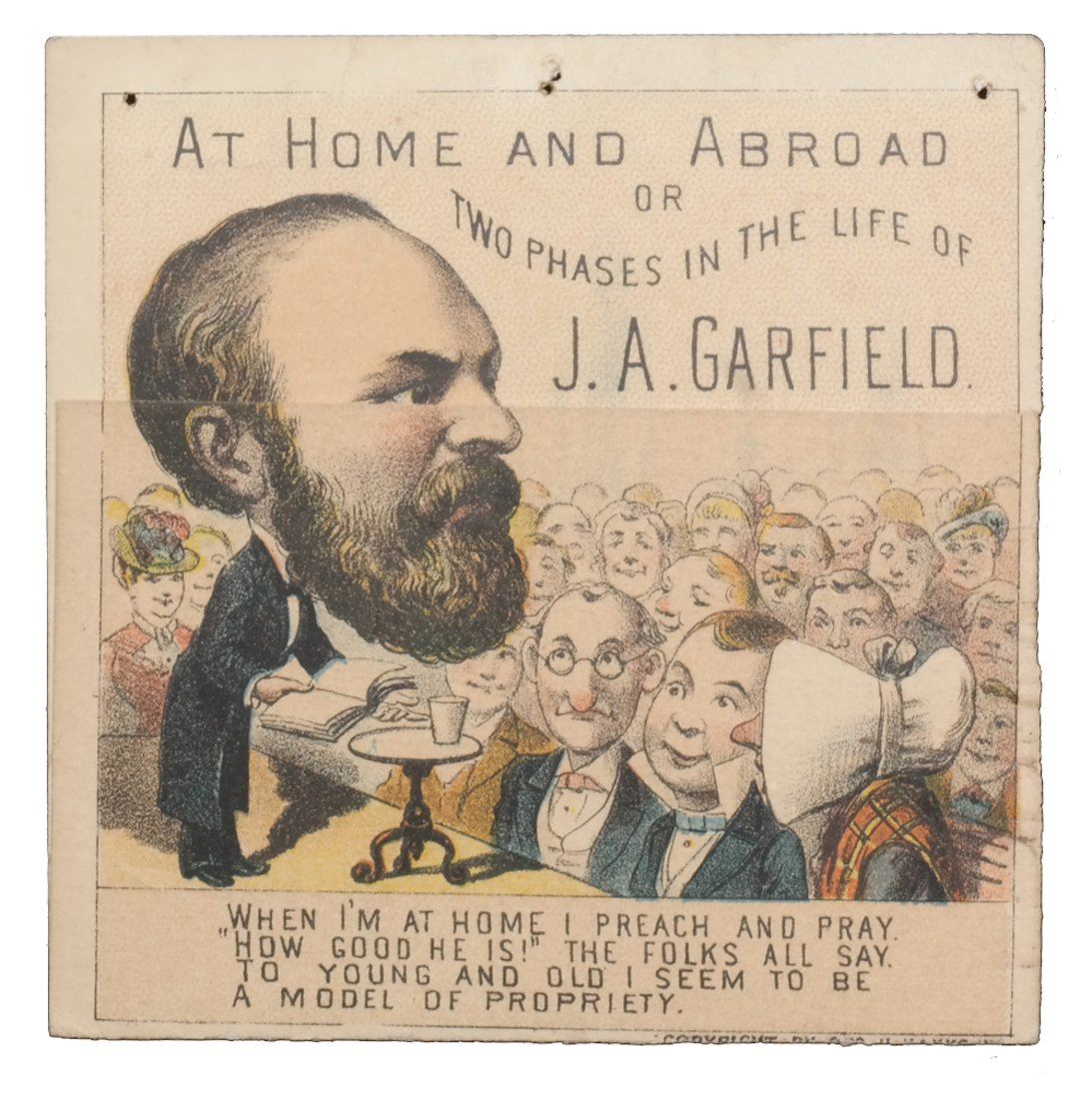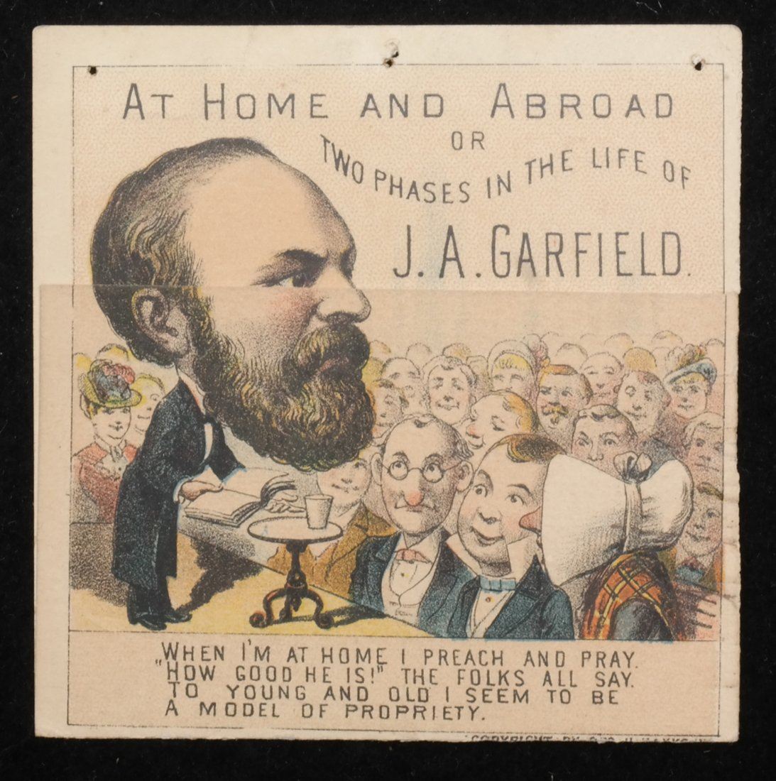 Fold-down satirical card. When closed, the image depicts caricature of Garfield on stage before a crowded audience with an open book [presumably a Bible]. The title above relates "At Home and Abroad or Two Phases in the Life of J.A. Garfield." Printed below this image "When I'm at home I preach and pray / 'How good he is!' the folks all say / To young and old I seem to be / A model of Propriety." When folded down to open position Garfield is depicted smiling and dancing with a young woman kicking up her dress and revealing her legs. Below this image a the text continues "When I'm abroad, as frequently / The care of state cause me to be, / I own I do in Washington / As other statesmen too have done. / And often while an hour away / with Ma'mselle C. Mobillier." Verso bears a 17 line verse titled "The Book of the Bribed", in part: "Abou Jim Garfield, may his tribe decrease! / Awoke one night from a deep scheme of fleece, / And saw that on the washstand in his room, / With fitful gleam half shining through the gloom / Like the faint flicker of a greenback boom, / Oakes Ames sat writing in a check book old..."