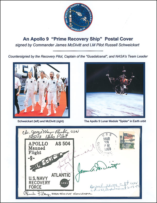 Apollo 9 prime recovery ship postal cover, with a cachet honoring the recovery of the capsule, signed in black felt tip by by Rusty Schweickart and green felt tip by James A. McDivitt; also signed by two recovery personnel. Removably presented on a color 8.5 x 11 informational sheet. In fine condition with Schweickart’s name a little light.