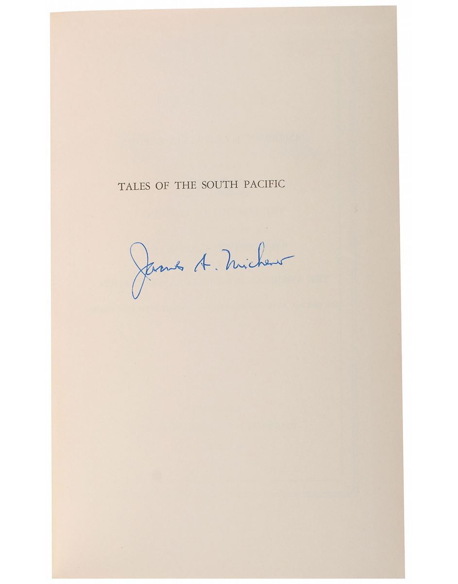 Signed book: Tales of the South Pacific. American Booksellers Limited Edition. NY: Macmillan, 1950. Hardcover, 5.75 x 8.5, 326 pages. Signed on the half-title page in blue ink. In fine condition, with light rubbing to spine and back cover, and trivial stray ink marks to top textblock.